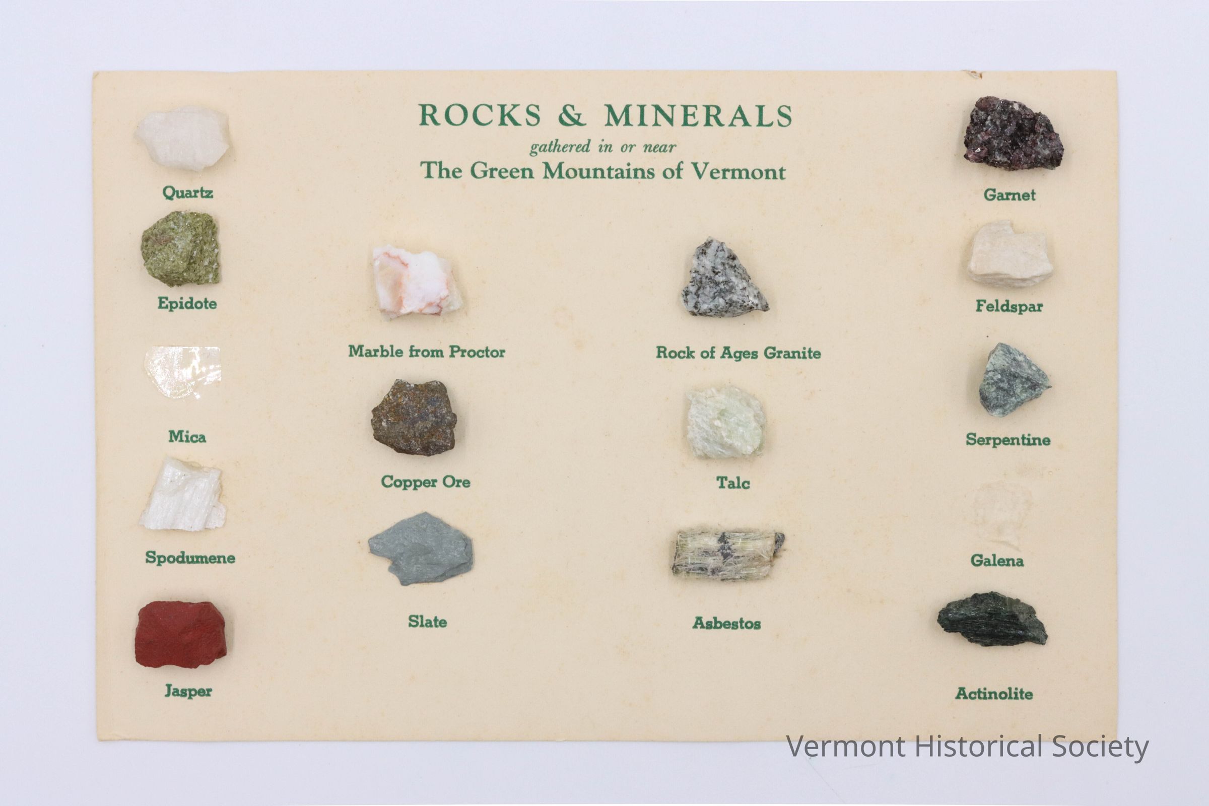 Rock collection in cardboard box. The collection consists of several small rock samples adhered to a piece of paper labeled, "ROCKS & MINERALS gathered in or near The Green Mountains of Vermont". The rocks are quartz, epidote, mica, spodumene, jasper, marble, copper ore, slate, granite, talc, asbestos, garnet, feldspar, serpentine, galena, and actinolite. Two of the rocks, mica and galena, are missing.Context