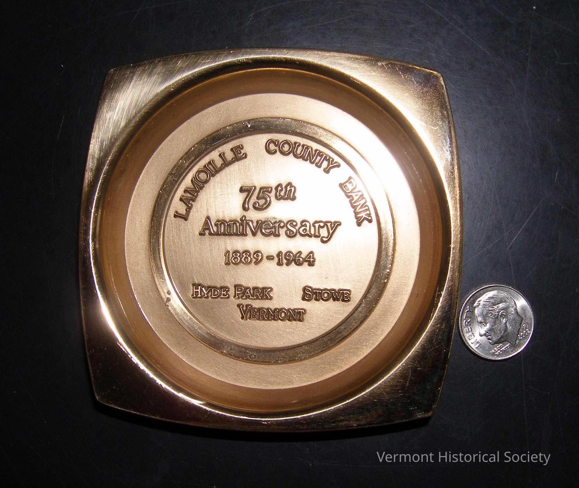 This is a commemorative souvenir ashtray made of metal. It is square with curved sides and no indents for cigarettes. The center of the ashtray is molded with the words "Lamoille County Bank 75th Anniversary 1889 - 1964 Hyde Park Stowe Vermont". On the bottom of the ashtray, there is tiny print that reads "Hyde Park" stamped into it.