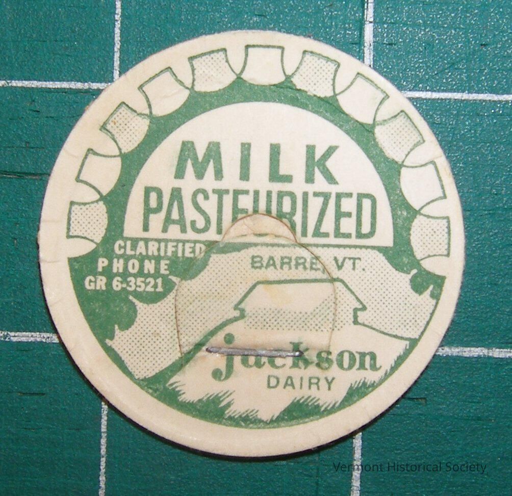 Tab for glass milk bottle lid. The tab is circular with a white background, a green geometric semicircle design and illustration of a barn on a hill. The text reads "MILK / PASTEURIZED / CLARIFIED / PHONE / GR 6-3521 / BARRE, VT. / jackson / DAIRY" inside the design. There is a staple at the base of the lid.Acquisition