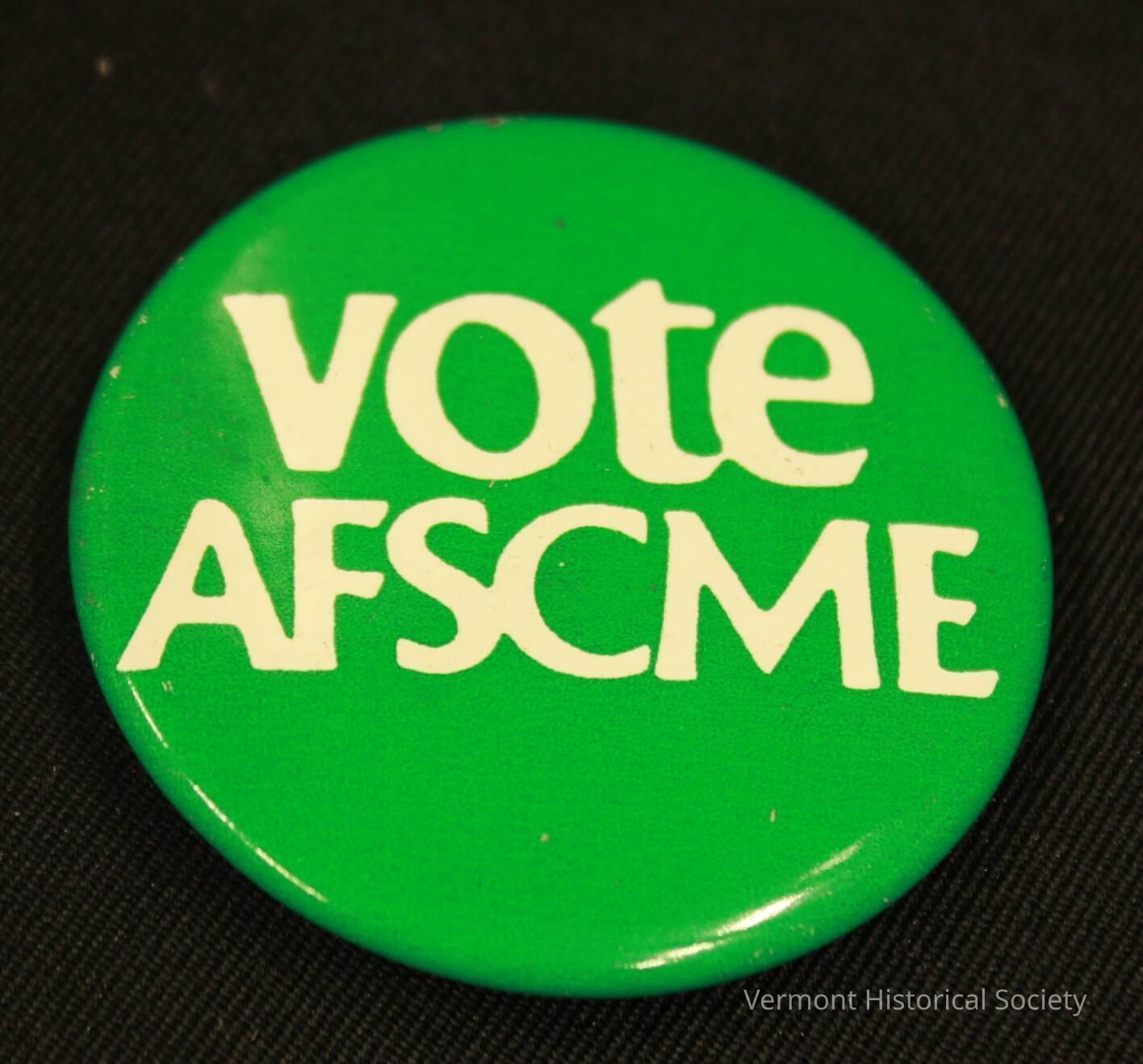 Round green metal button with the white inscription, "vote AFSCME".