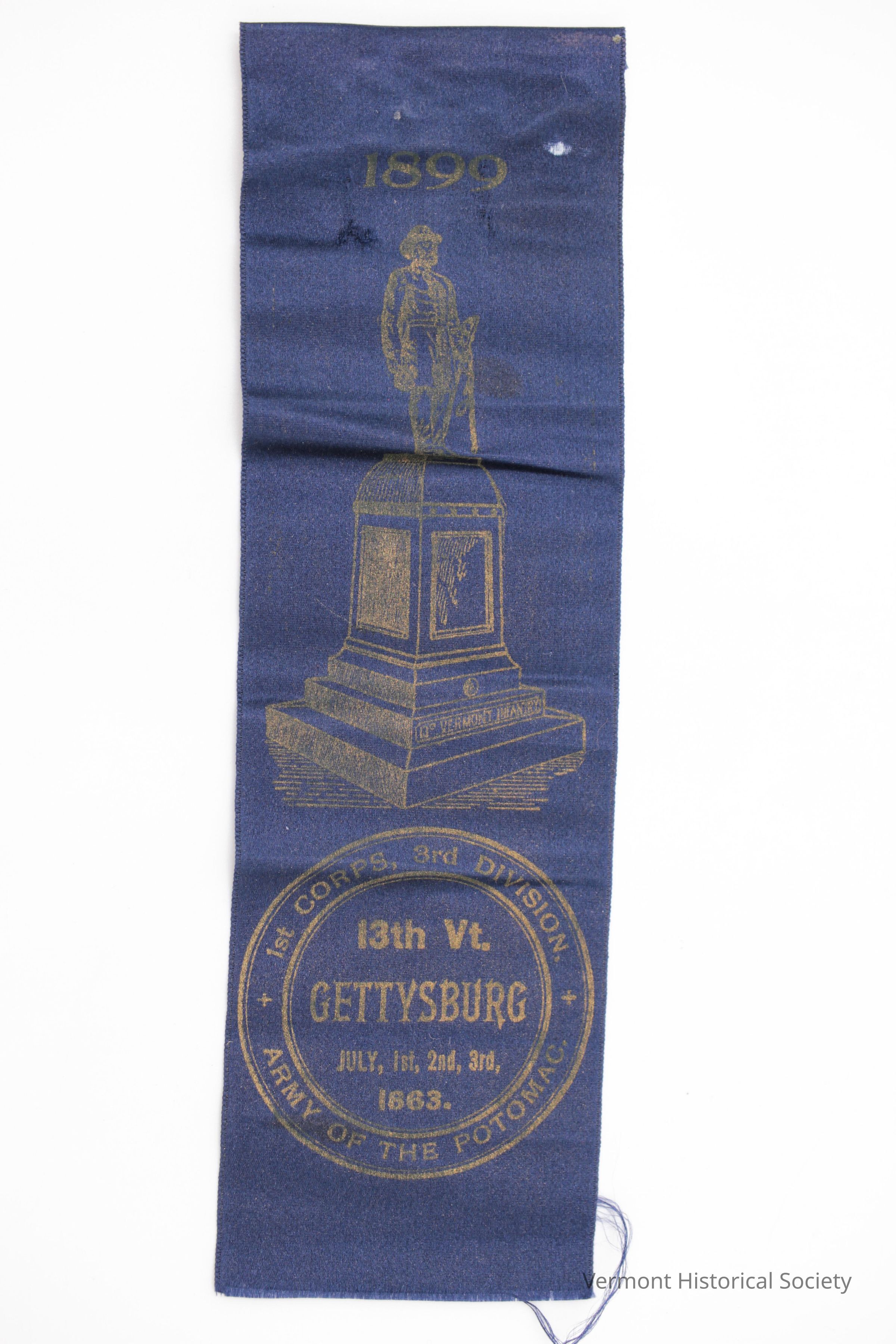 Blue satin-woven silk ribbon printed in gold with an image of a monument. The monument consists of a man wearing a Civil War uniform standing on a plinth. The date 1899 is above the monument. Within a circle below the monument is the inscription, "13th Vt. GETTYSBURG JULY, 1st, 2nd, 3rd, 1863." The inscription is ringed by the words, "1st CORPS, 3rd DIVISION. ARMY OF THE POTOMAC."Context