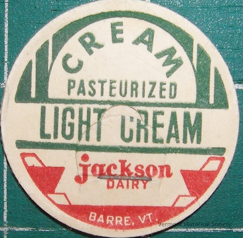 Tab for cream bottle lid. The tab is circular with a white background and a green and red geometric design along the edges. The text "CREAM / PASTEURIZED / LIGHT CREAM / jackson / DAIRY" is printed inside the design, with the first four words being green and the last two red. There is a staple at the base of the lid.Acquisition