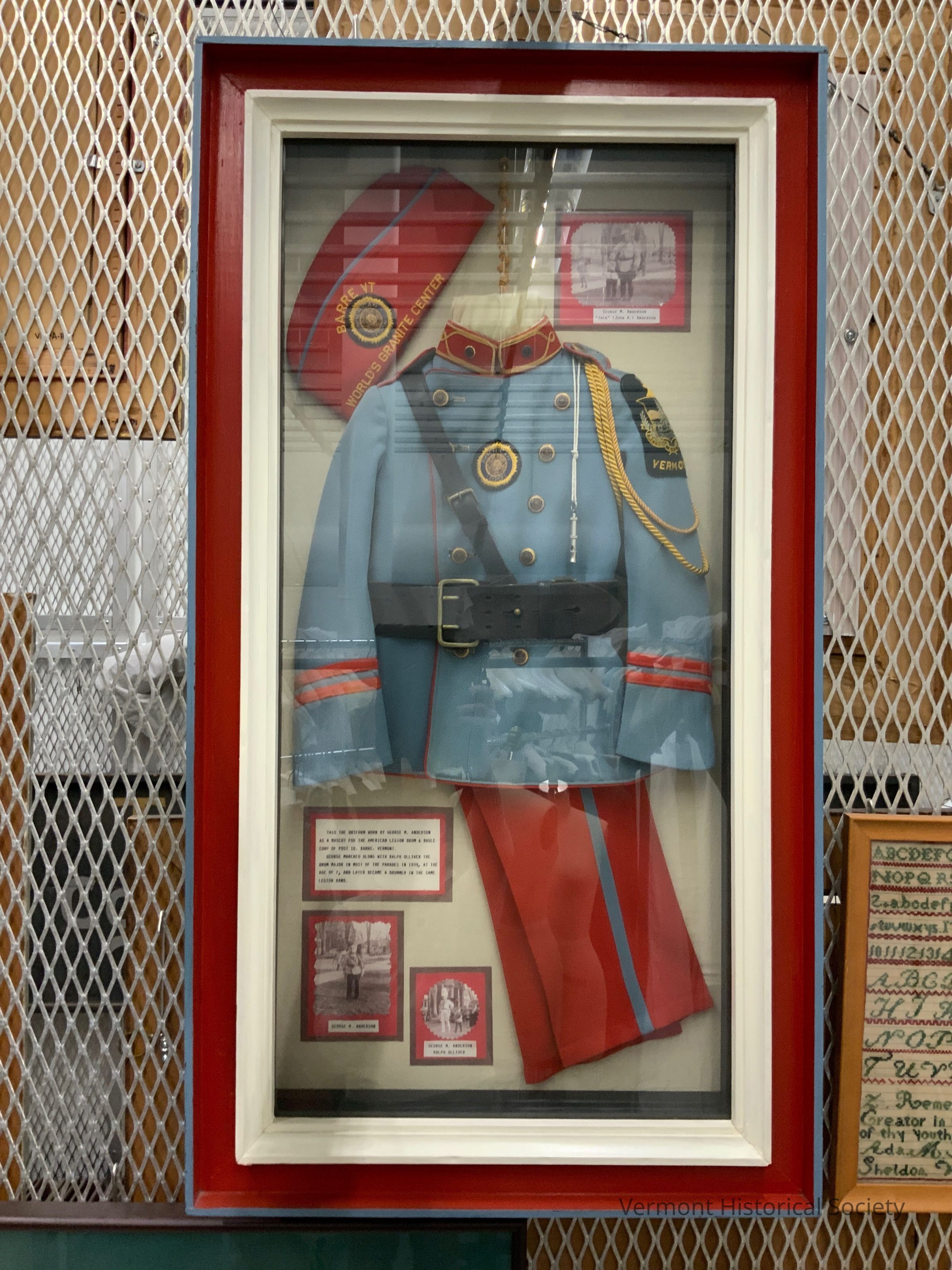 Children's American Legion Drum & Bugle Corp uniform, comprised of a jacket, pants, and hat. The jacket is light blue, with a red collar with gold piping, and red stripes on the sleeves, as well as along the hems. There is a thick belt and cross body strap, both black with buckles. There are two vertical rows of buttons flanking a circular patch in the middle. On the left shoulder is a Vermont patch, three golden cords and a silver whistle on a cord . The hat is red, with a circular patch and the words "BARRE VT / WORLD'S GRANITE CENTER" embroidered in gold thread on the side. The piping is blue. The pants are red with a blue stripe down the side. Displayed with the uniform are photos of it being worn.Context