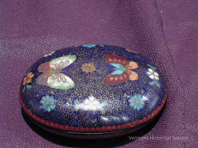 Small oval snuffbox. The lid is enameled with a design of butterflies and flowers on a blue ground.
