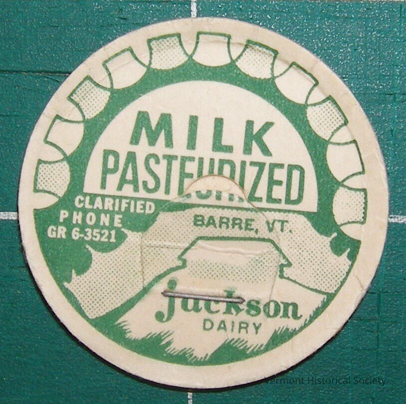 Tab for glass milk bottle lid. The tab is circular with a white background, a green geometric semicircle design and illustration of a barn on a hill. The text reads "MILK / PASTEURIZED / CLARIFIED / PHONE / GR 6-3521 / BARRE, VT. / jackson / DAIRY" inside the design. There is a staple at the base of the lid.Acquisition