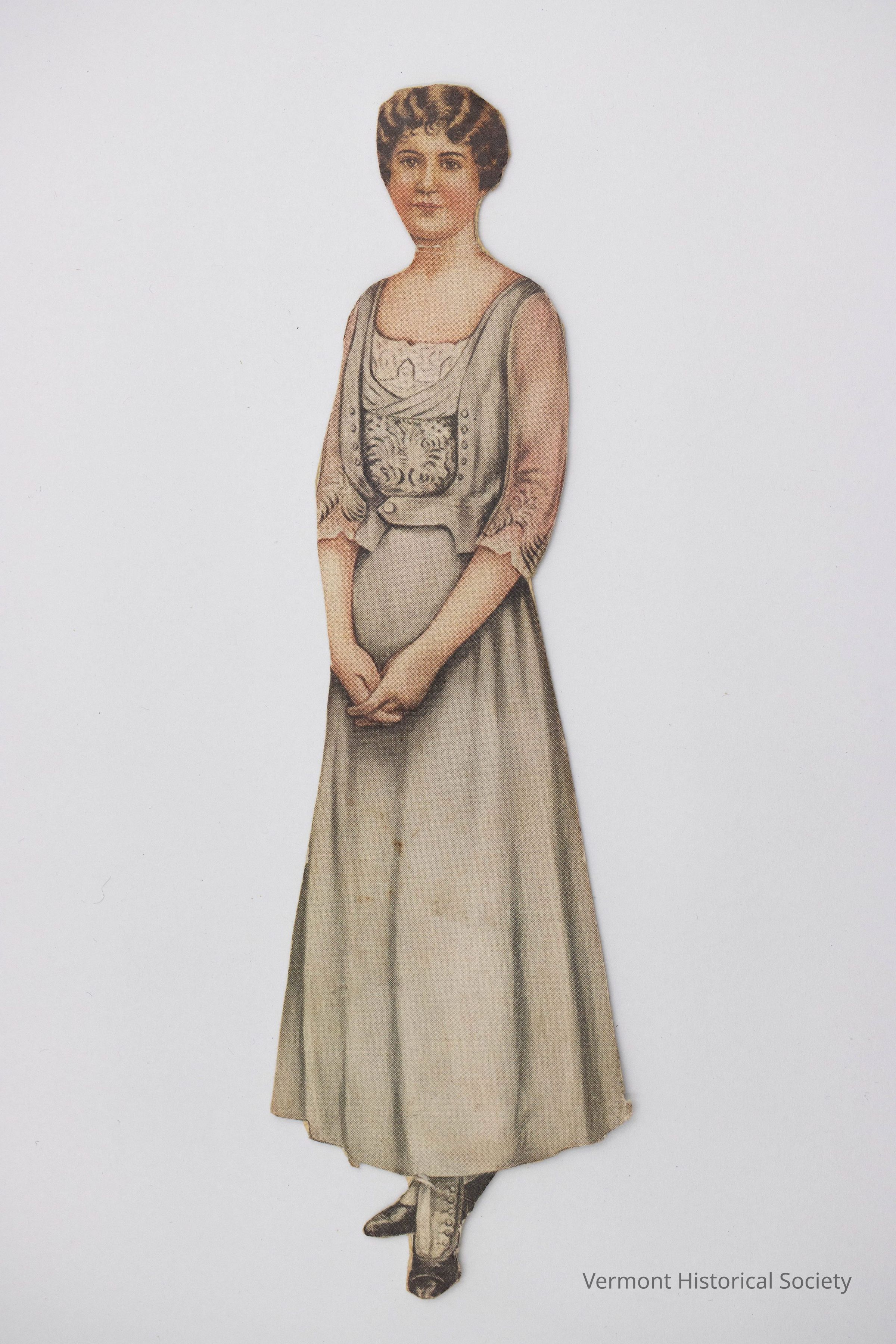 Printed paper doll showing a pink-skinned, brown-haired woman wearing a white Edwardian-style dress.Context