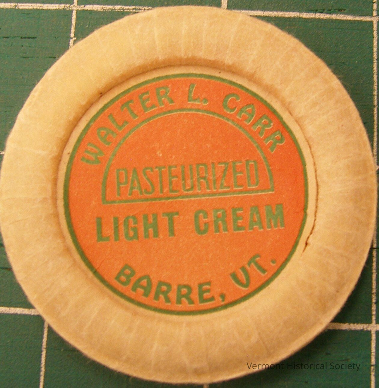 Cardboard cap for bottle of pasteurized light cream. The cap has an orange circle in the center, with "WALTER L. CARR / PASTEURIZED / LIGHT CREAM / BARRE, VT." printed in green text.