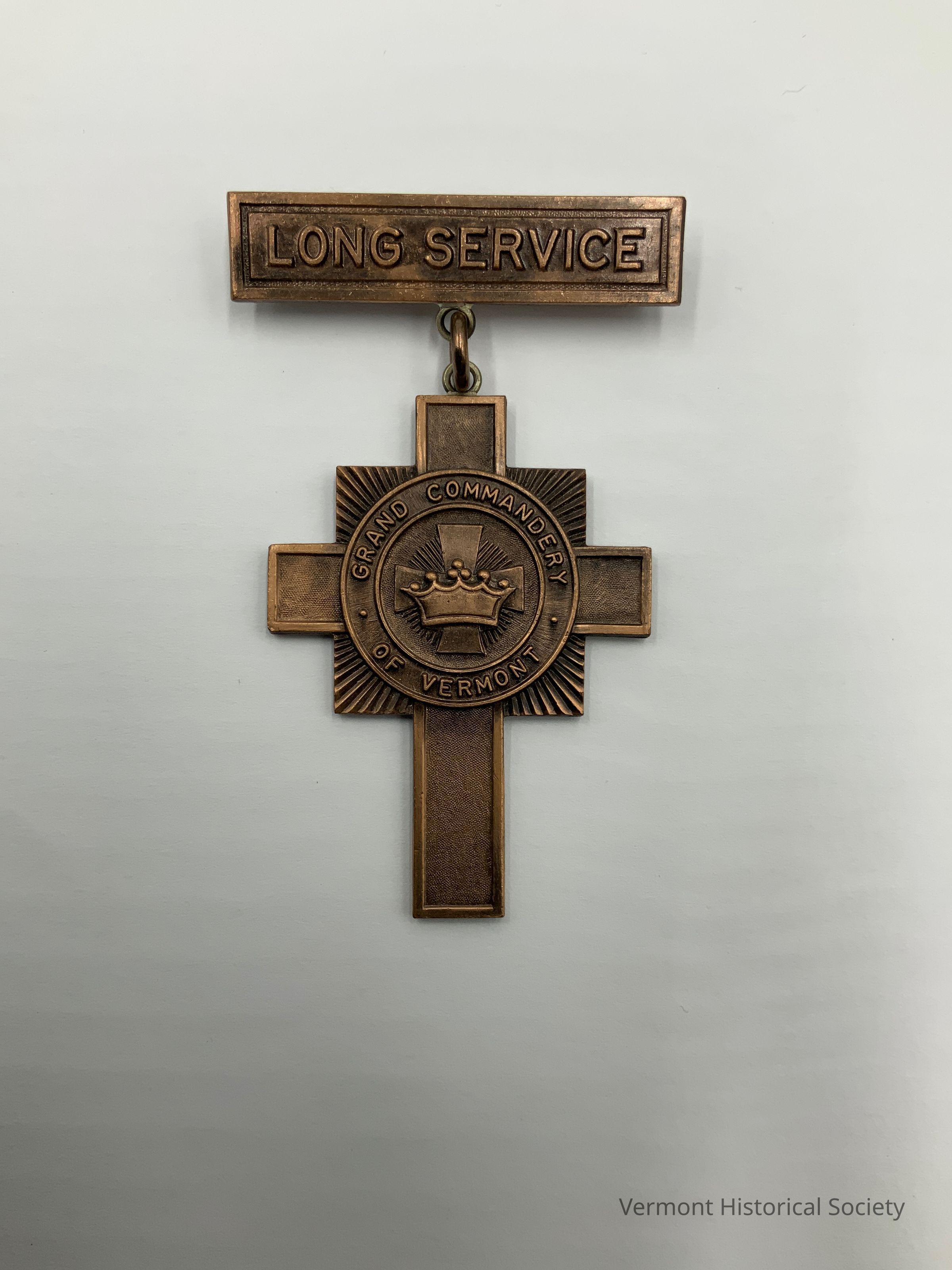 Metal membership badge consisting of an upper bar and cross-shaped medallion. The upper bar is molded with the words, "LONG SERVICE" on the front and has a long, hinged pin on the back. The medallion hangs from the center of the bar by an eye ring. At the center of the cross shaped medallion is a circle with the words "GRAND COMMANDERY OF VERMONT" encircling another cross and a crown.