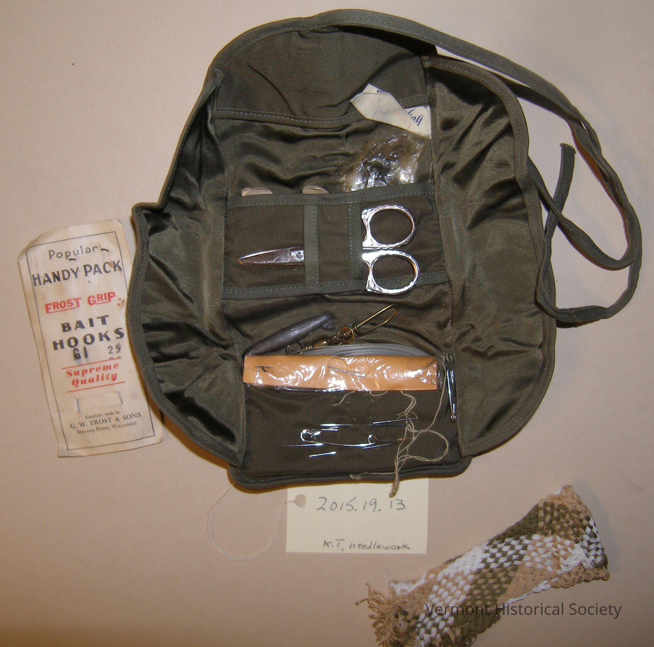 Olive green nylon roll-up back containing sewing notions and fishing hooks. The back unrolls to shows two side pockets and central pouch. Inside the pack are scissors, thread, buttons, safety pins, needles, fishing hooks, fishing line, and fishing lures. A tag inside the pouch reads, "Style King Muchsbaum Manufacturers in 1888 Chicago."Context