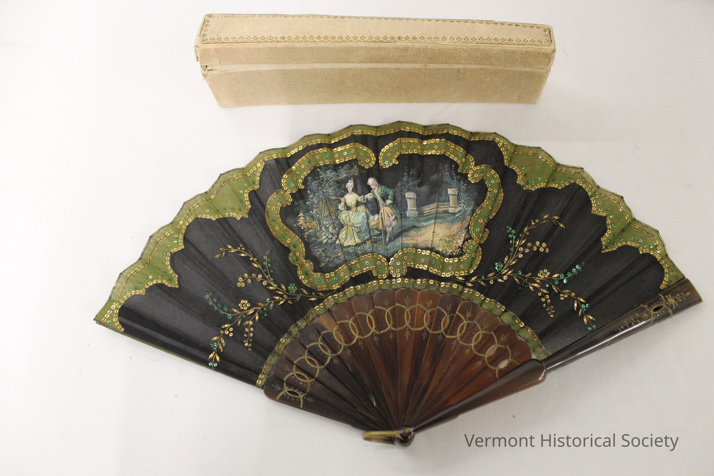Black and olive green fan with sparkly gold and green sequins. Scene in the middle of the fan is of a lady and a gentleman. Brown plastic at the bottom of the fan.