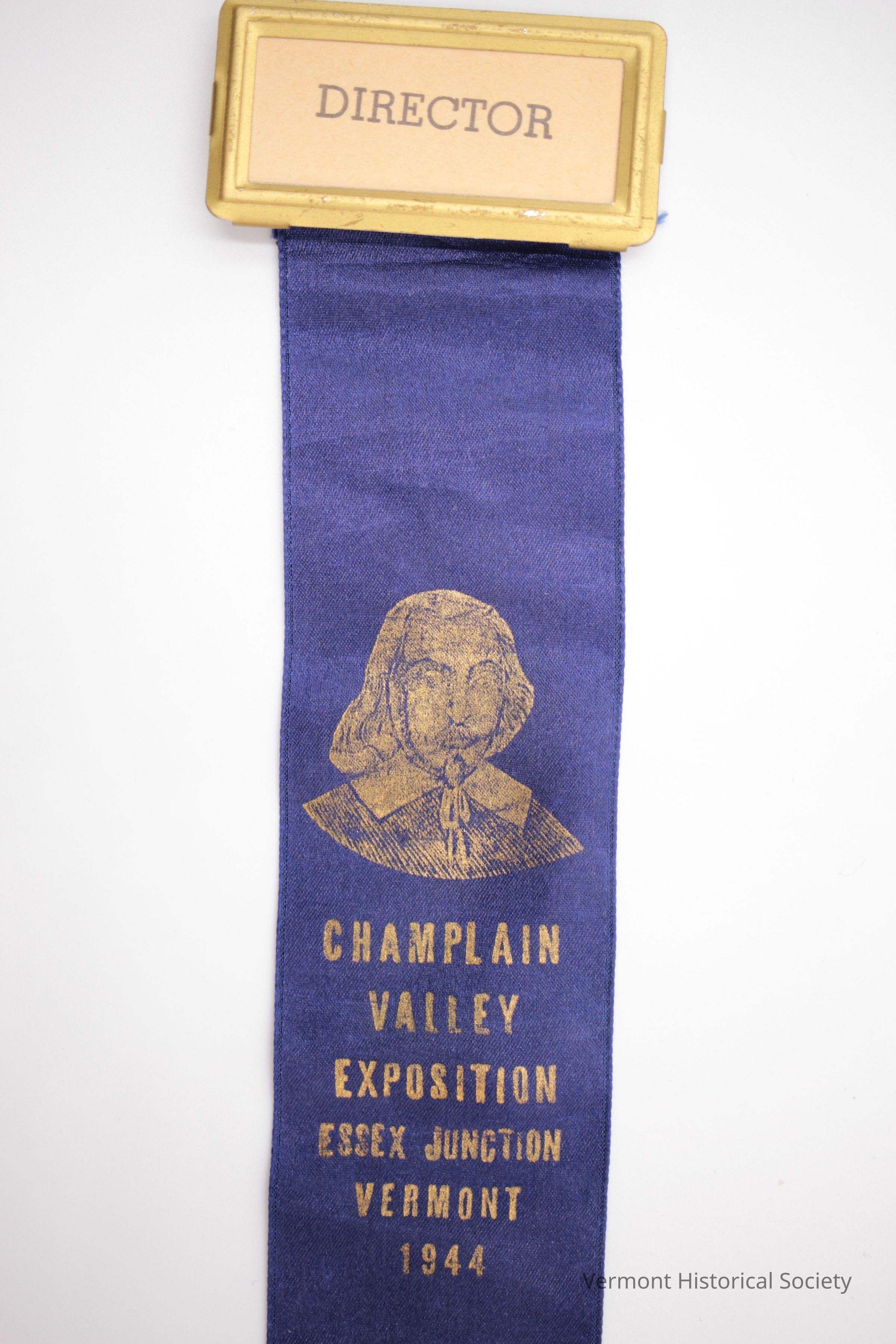 Blue ribbon printed in gold with an image of a man in 17th century clothing (Samuel de Champlain) and the inscription, "CHAMPLAIN VALLEY EXPOSITION ESSEX JUNCTION VERMONT AUG. 29-SEPT. 3 1938". The top of the ribbon is attached to a gold-framed name tag that reads, "DIRECTOR", and has a pin on the back.