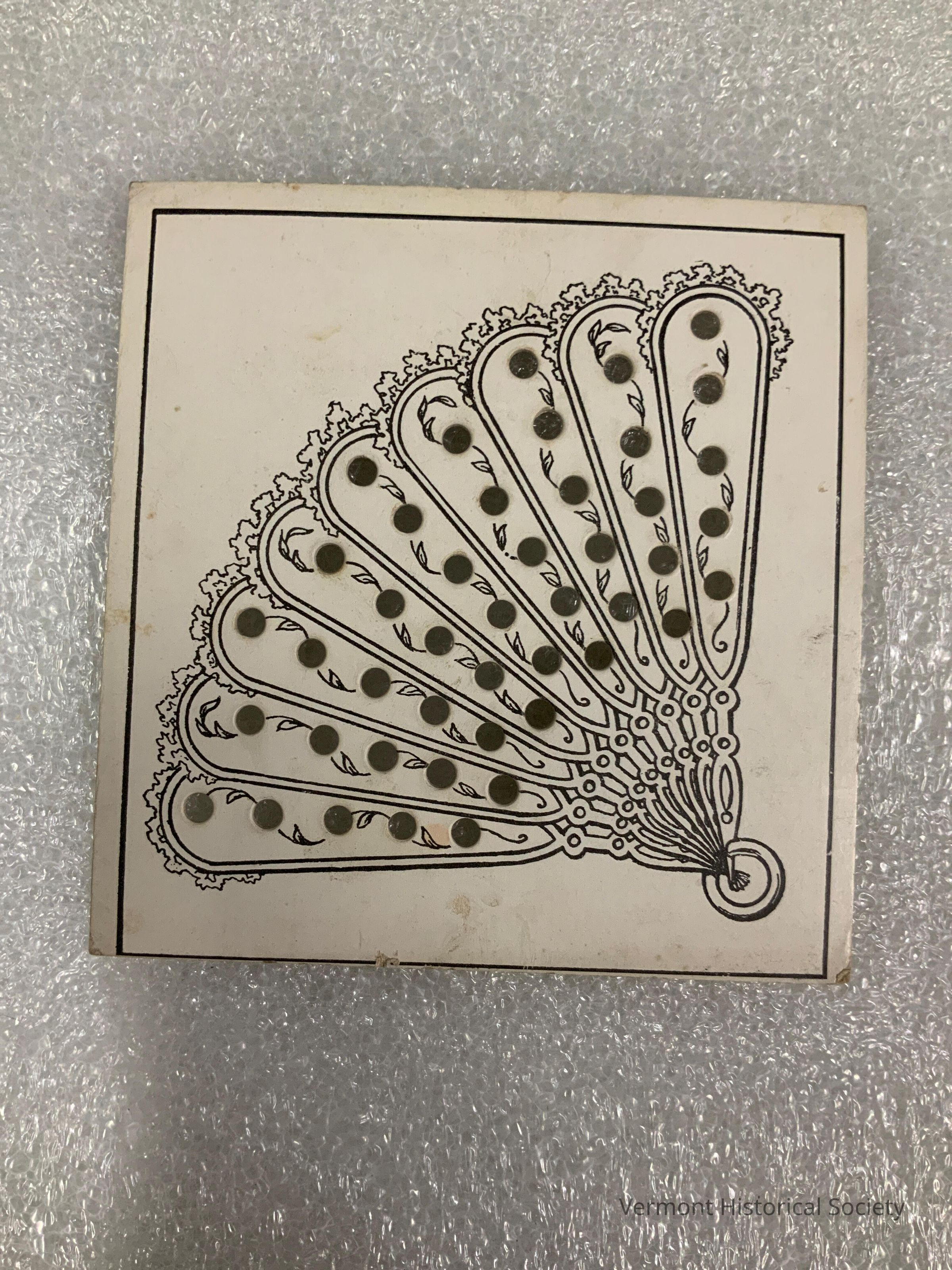 Square cardboard sewing card printed on one side with a line drawing of a partially unfolded hand fan. Each leaf of the fan is punched with a line of round holes over a printed vine.