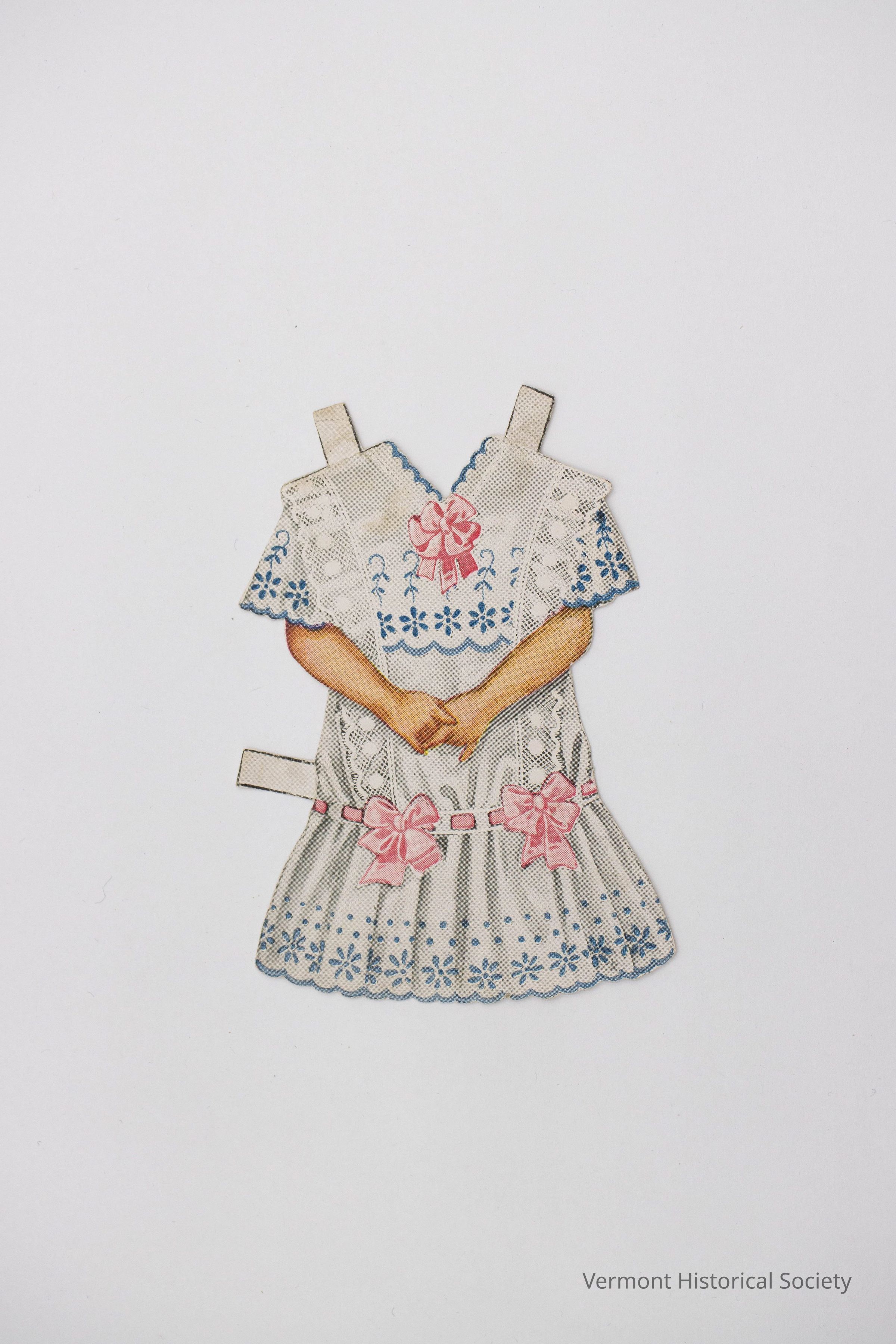 Printed paper dress for a paper doll. The dress is white with blue flowers and pink bows. The back is labeled in ink, "Party Dress."Context