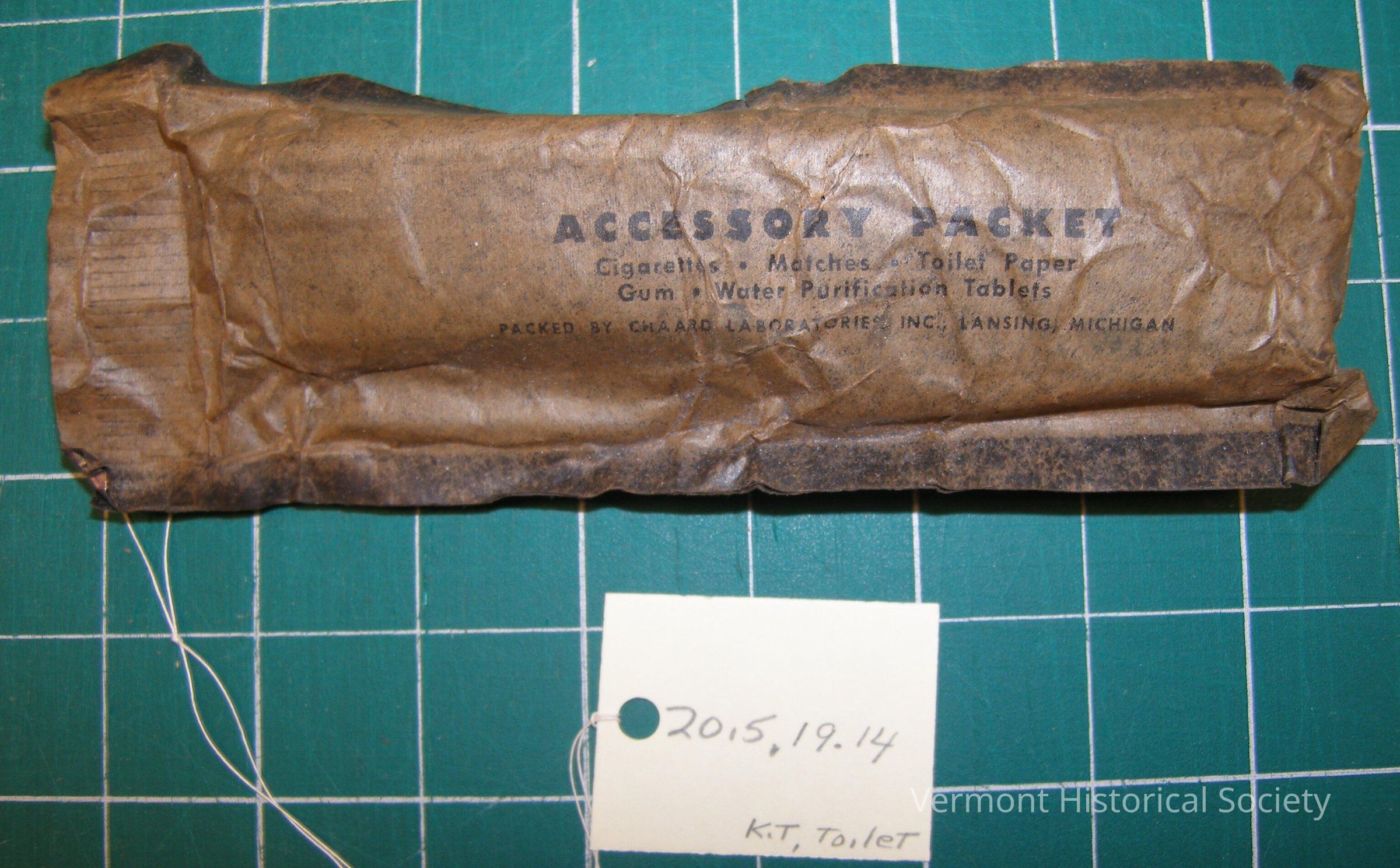 Unopened paper-wrapped pouch. The pouch is labeled, "ACCESSORY PACKET Cigarettes . Matches . Toilet Paper . Gum . Water Purification Tablet PACKED BY CHAARD LABORATORIES, INC. LANSING, MICHIGAN." The back of the pouch has the inscription, "NOTICE; MOSQUITO BITES CAUSE MALARIA" and "INSTRUCTION FOR THE USE OF WATER PURIFICATION TABLETS". Each inscription is followed by further instructions.