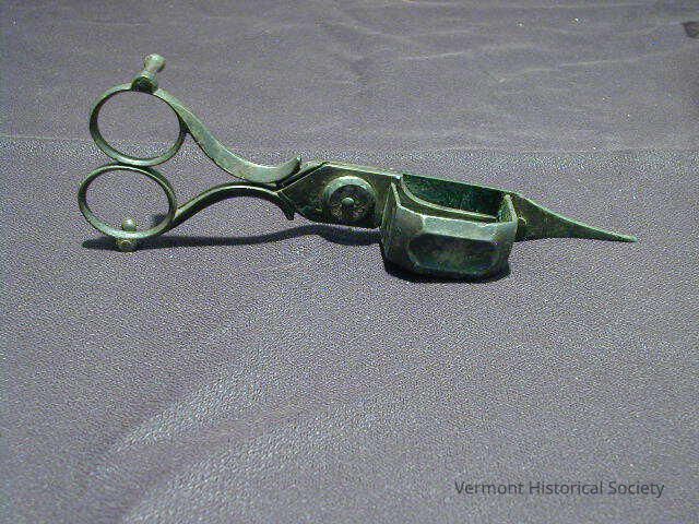 Candlesnuffer and wick trimmer. It is in the form of scissors. One blade has a three-sided box attached to it. There are 2 spokes on the bottom to hold the tool off the resting surface.
