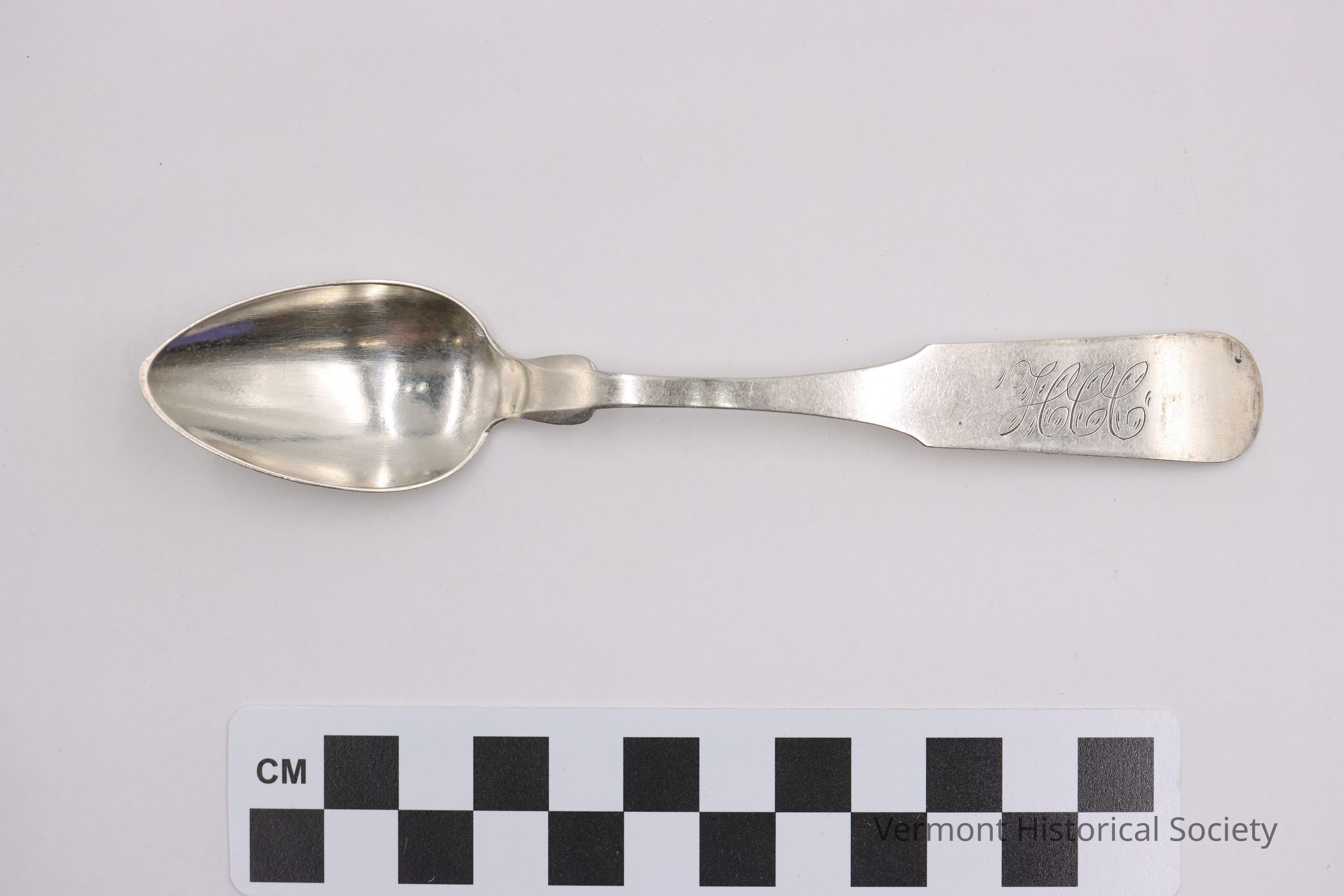 1 of 6 matching coin silver teaspoons. It has a downturned fiddle handle with medium shoulders. The handle is engraved with the initials HCC. The back of the handle is marked "J.S.ABBOTT." within a rectangle.