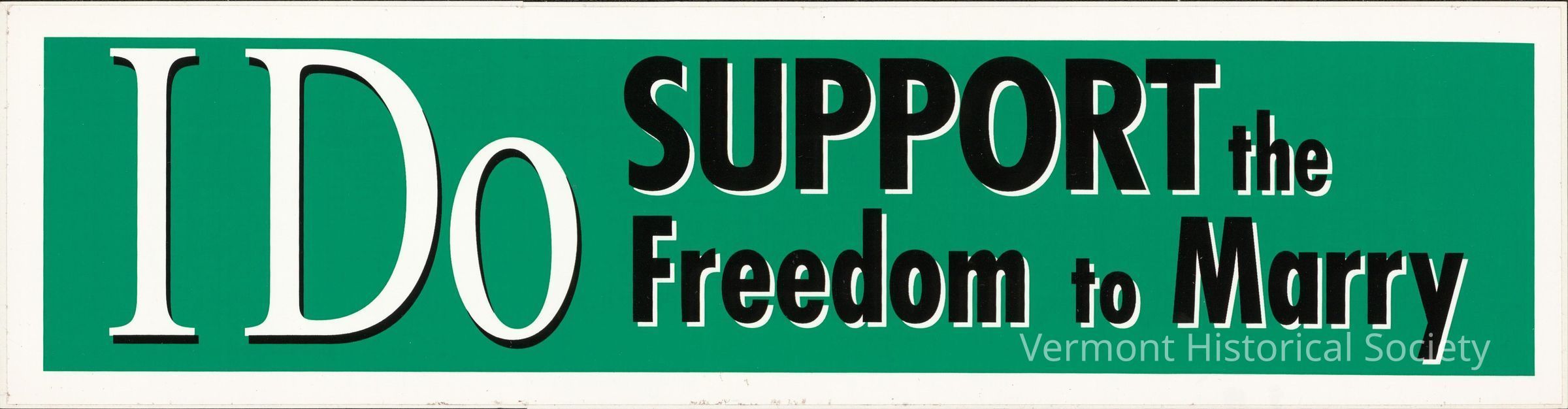 Bumper sticker with "I Do SUPPORT the Freedom to Marry" in black and white text on green background.