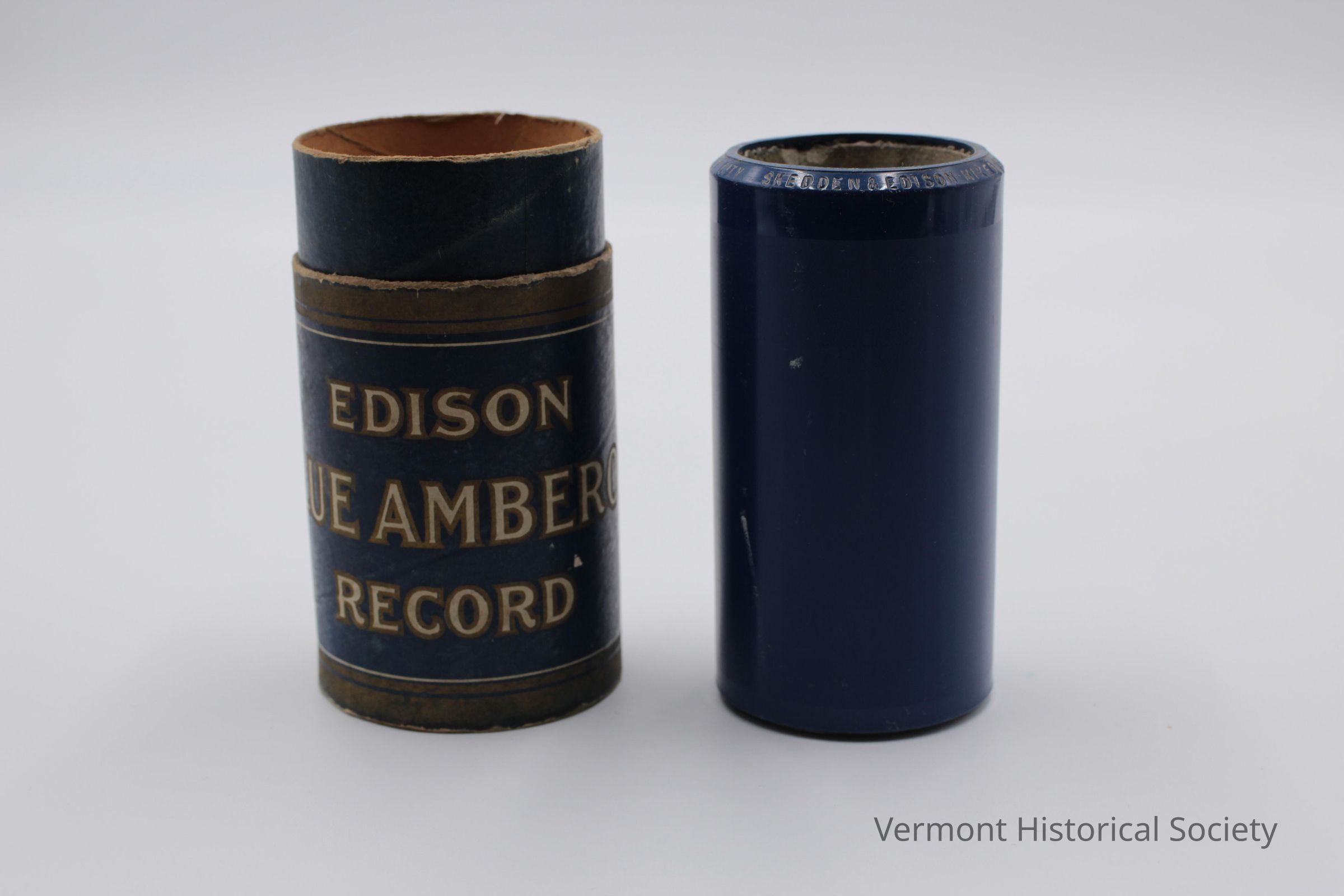 Blue phonograph cylinder with a cardboard case. The cylinder, or "record", is a hollow cylinder consisting of hard, blue, ridged celluloid around a concrete core. One edge of the cylinder is labeled in white with the words, "1601 HOLY CITY. SKEDDEN & EDISON MIXED QUAR. / Thomas A Edison PAT'D. 24."