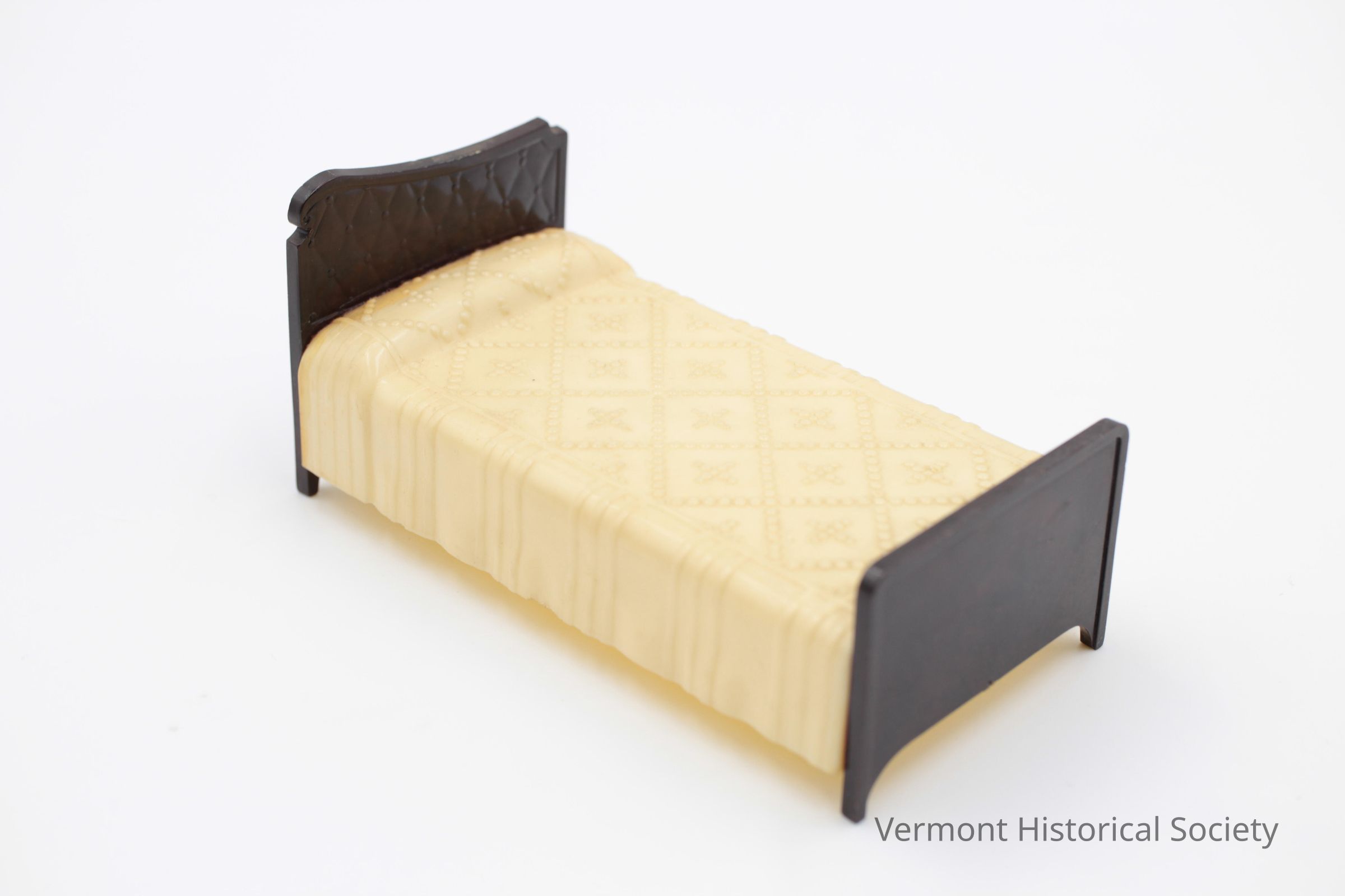 Miniature plastic bed sized for a dollhouse. The bed has a foot and head molded from marbleized brown plastic. The bed surface is molded to look like it's covered with a cream-colored candlewick counterpane, rolled over a pillow at the head.Context