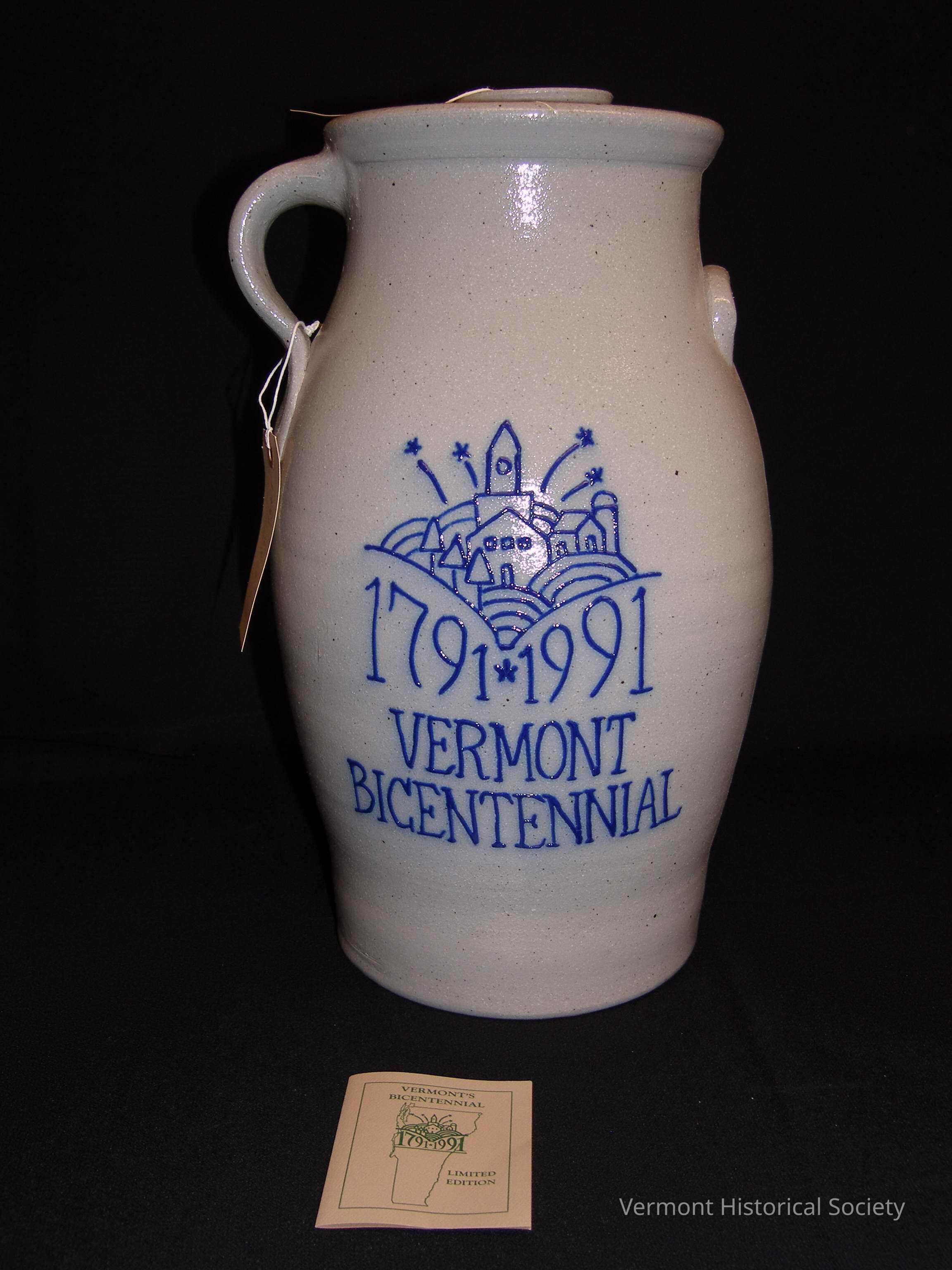 2-gallon stoneware butter churn with blue slip decoration showing the logo for the Vermont Bicentennial. The churn has one jug handle and one lip handle. The logo consists of a primitive depiction of fields, trees, a barn, a church, and fireworks above the inscription, "1791 1991 VERMONT BICENTENNIAL". The bottom of the crock is incised with the inscription, "1/250 LTD." The interior is brown glazed. The churn has a small, round lid that fits into the upper rim. At the center is a round, circular handle with a hole for the dasher. The underside of the lid is glazed pink.Context