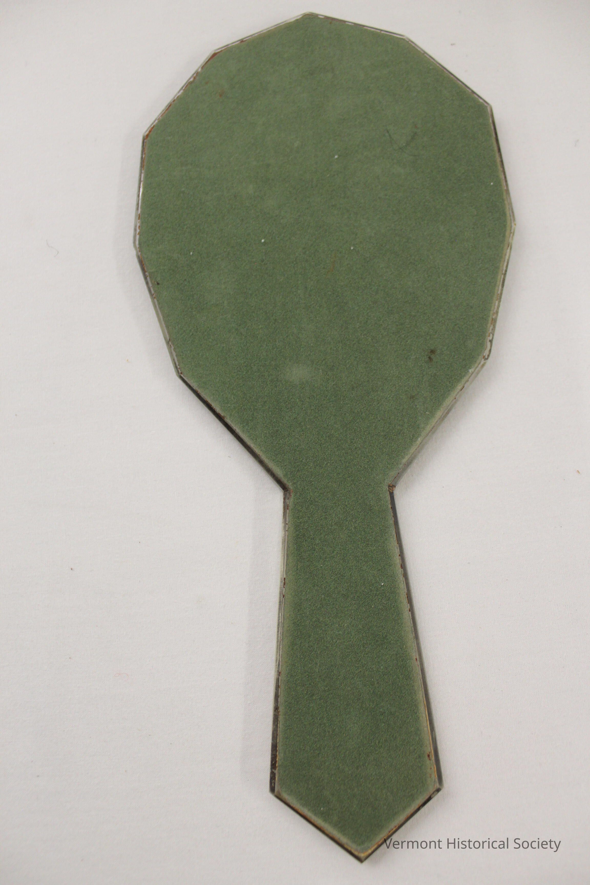 Hand-held mirror with writing in gold on the bottom that says "French Gratitude Train 1948." The back of the mirror is covered in a green fuzzy material.