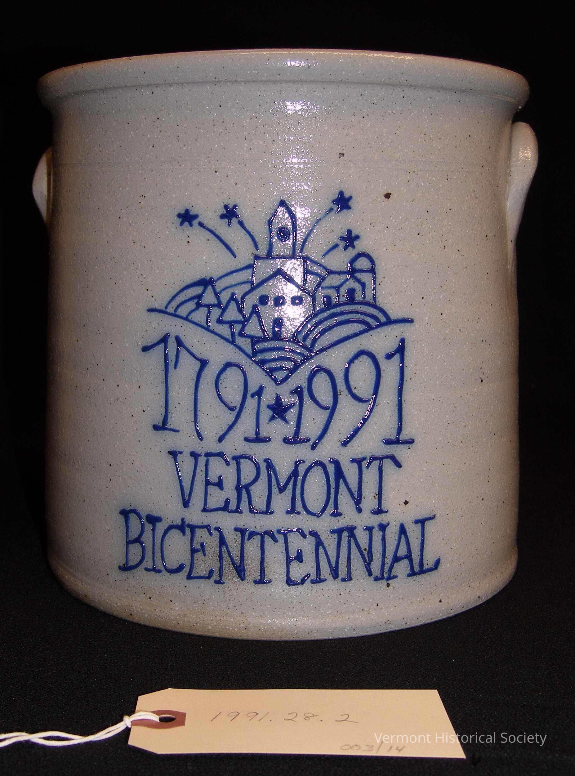 Large stoneware crock with blue slip decoration showing the logo for the Vermont Bicentennial. The straight-sided crock has U-shaped handles on either side. The logo consists of a primitive depiction of fields, trees, a barn, a church, and fireworks above the inscription, "1791 1991 VERMONT BICENTENNIAL". The bottom of the crock is incised with the inscription, "1/1000 Ltd." The interior is brown glazed.Context