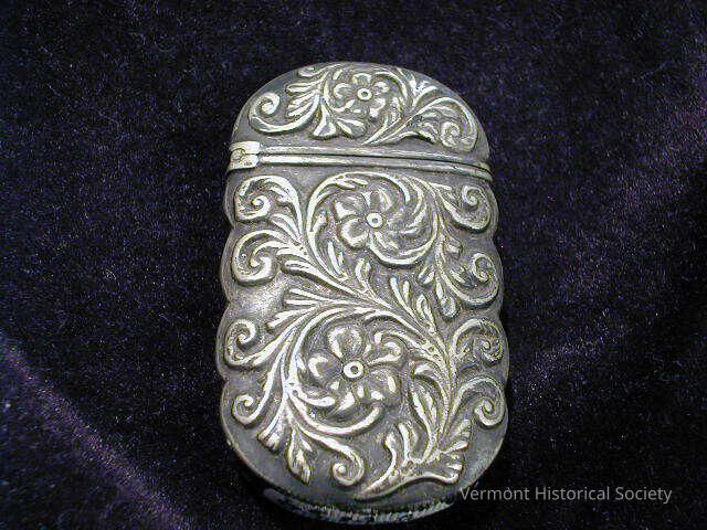 Oval metal match safe with raised floral design. The lid hinges upward from one side.