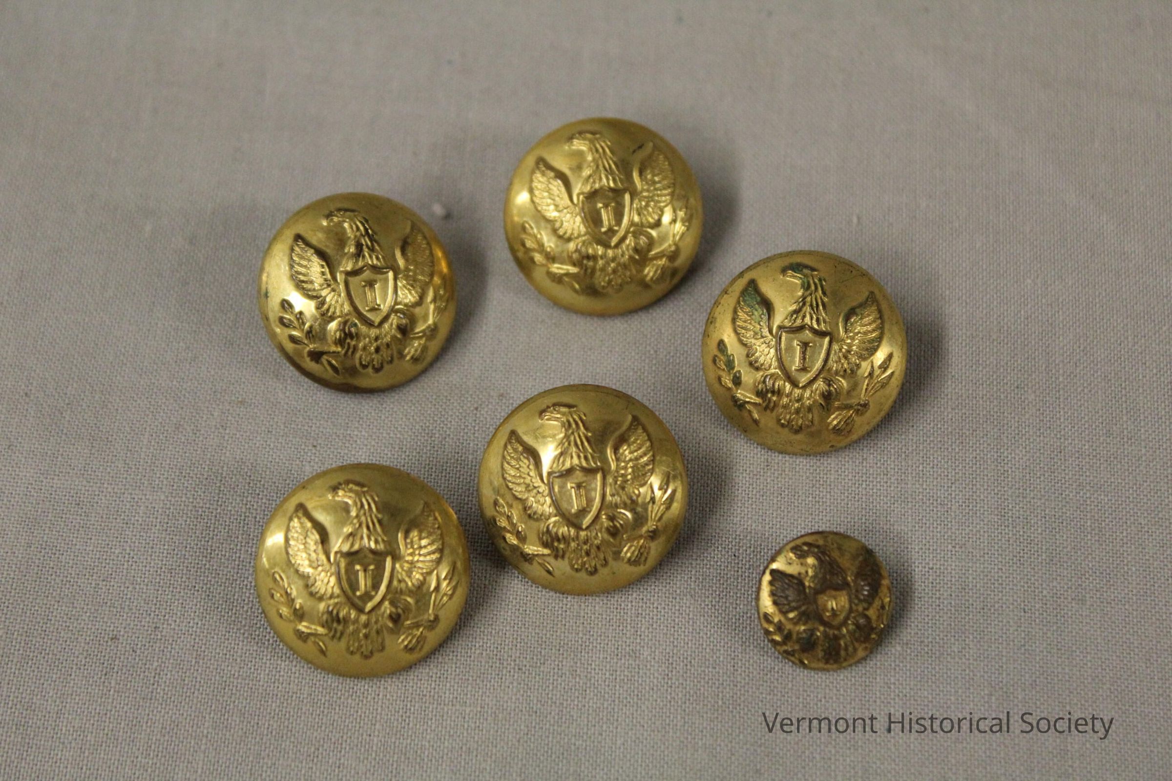Six brass buttons molded with federal eagles. Each eagle has a sword with the letter I in the center.
