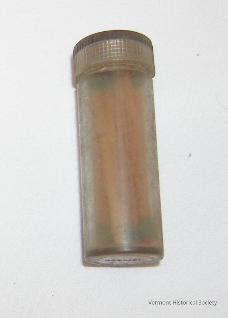 Round clear plastic tube with a screw-on plastic cap. The tube is filled with unused matches with green heads and a red head tip. The cap is molded with the number, "42A6932", and the bottom of the tube is molded with number, "42A6931".Context