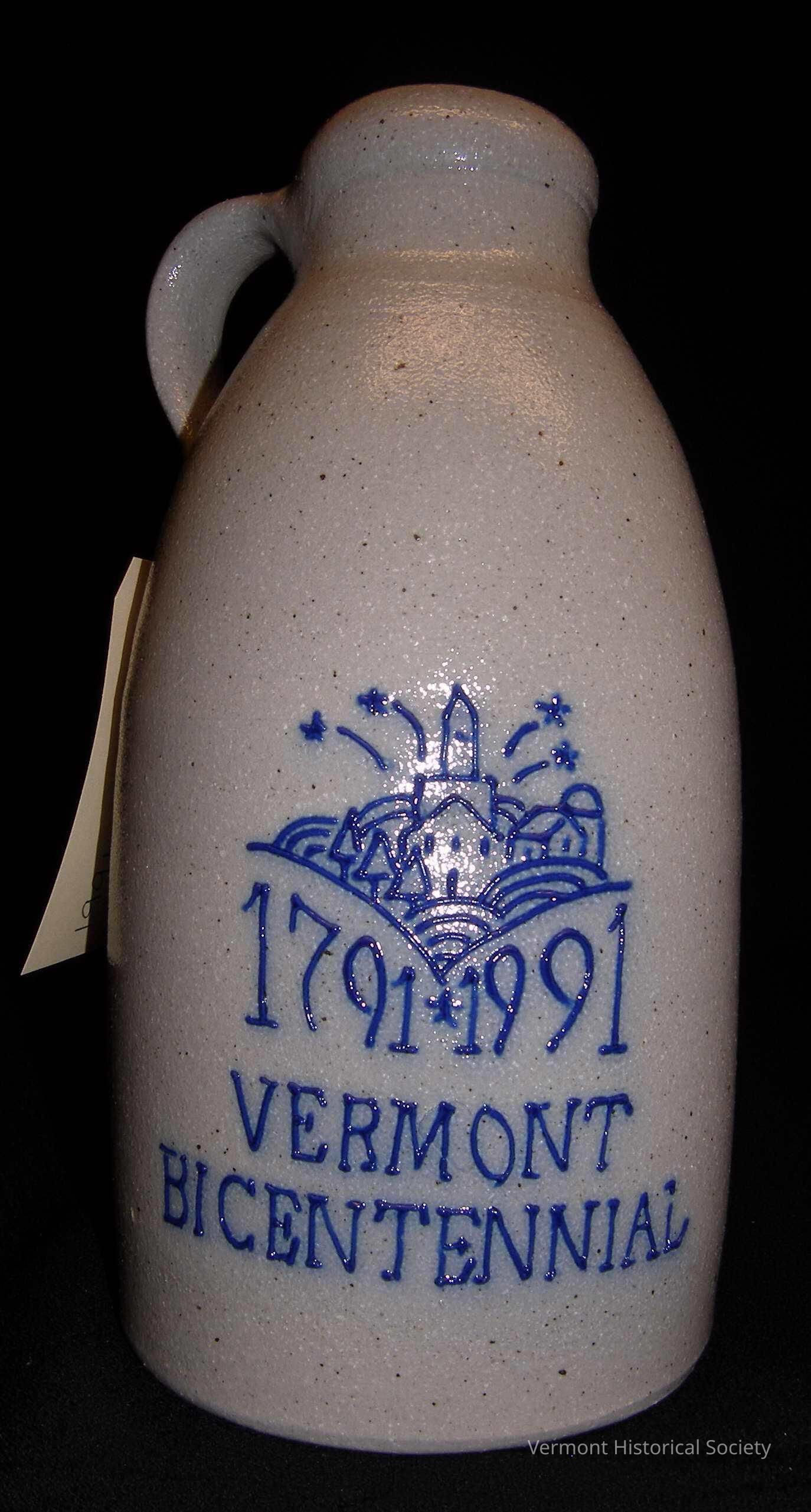 Large stoneware jug with blue slip decoration showing the logo for the Vermont Bicentennial. The jug has a small, round handle attached to the top. The logo consists of a primitive depiction of fields, trees, a barn, a church, and fireworks above the inscription, "1791 1991 VERMONT BICENTENNIAL". The bottom of the jug is incised with the inscription, "Ltd 1/2500".Context