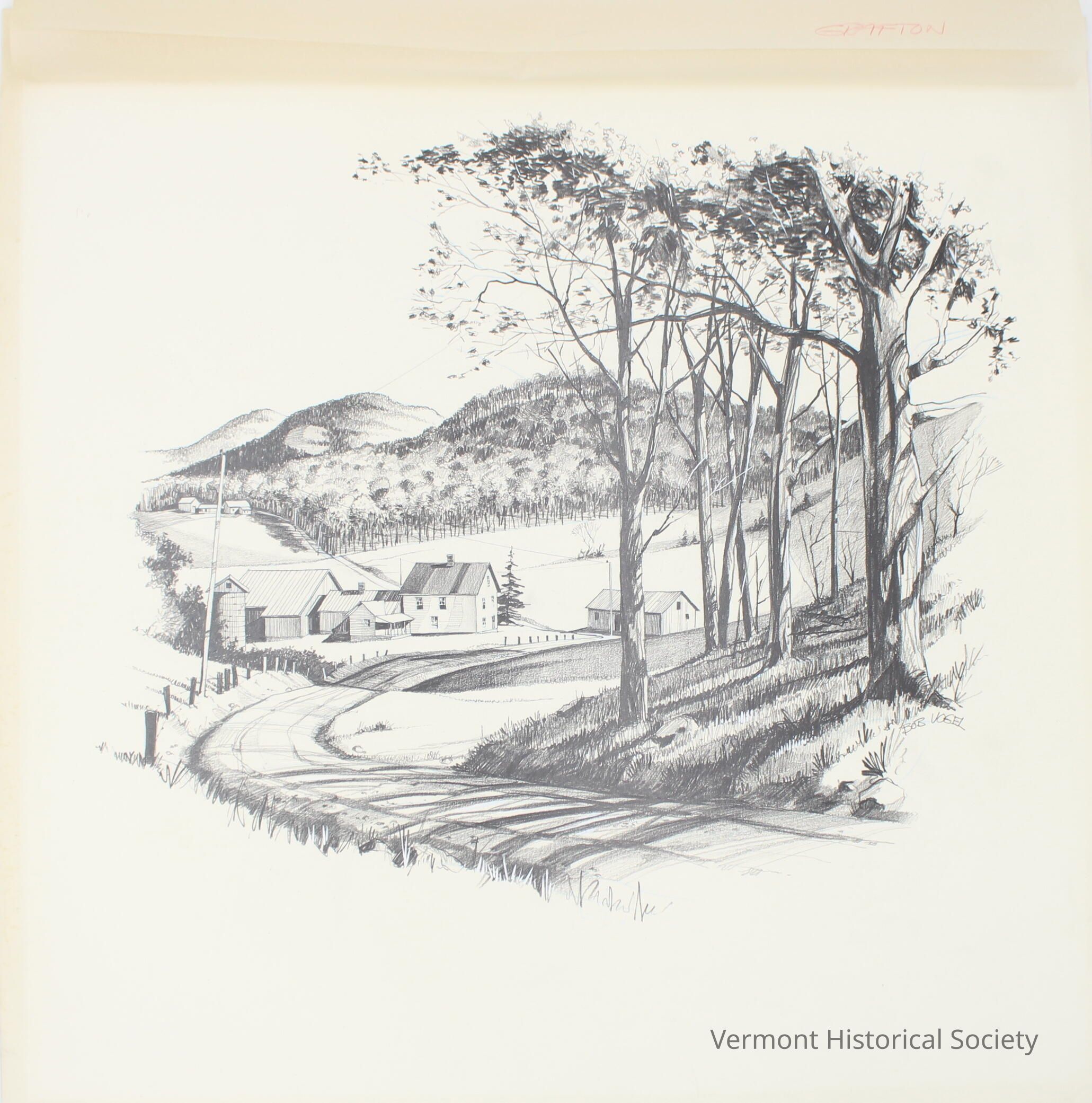 Drawing on board showing a deeply rutted road leading to a farm complex. A fence runs along the road on one side, and a copse of young trees is on the other. Rolling mountains and another farm complex can be see in the distance.Type of Drawing