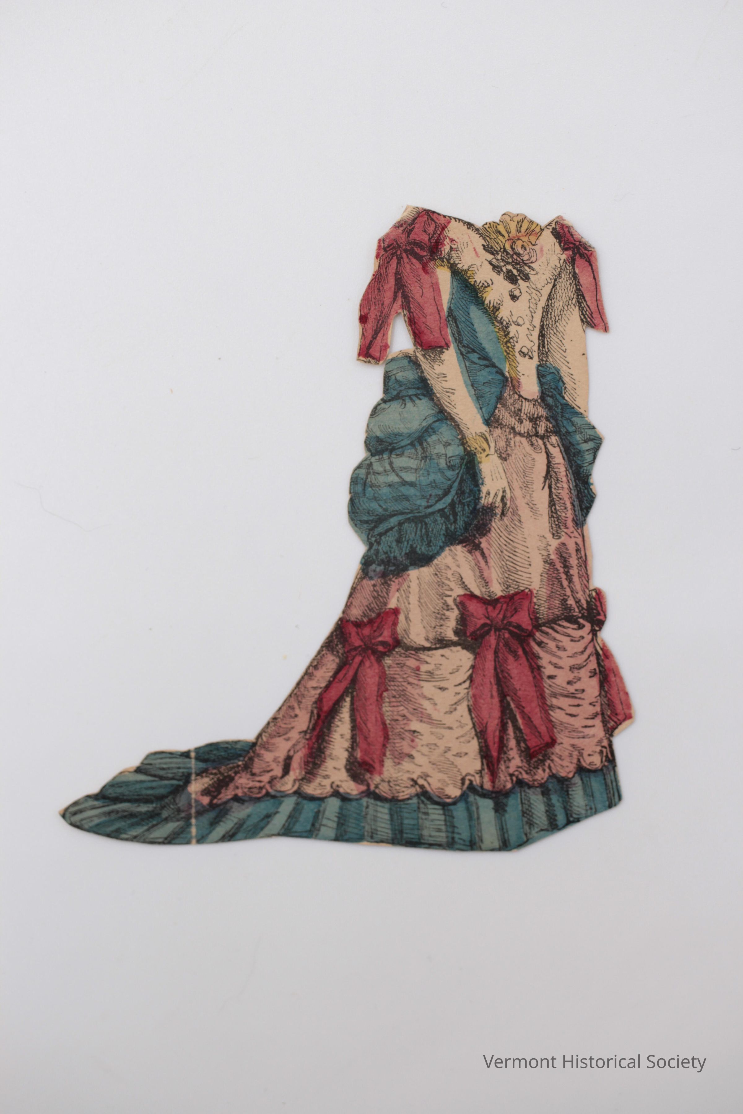 Paper doll dress. The elaborate dress has a blue bodice with a white front, blue bustle, and pink skirt with a blue hem. The skirt and shoulders are decorated with large pink bows, and there is a rose at the center front neckline.Acquisition