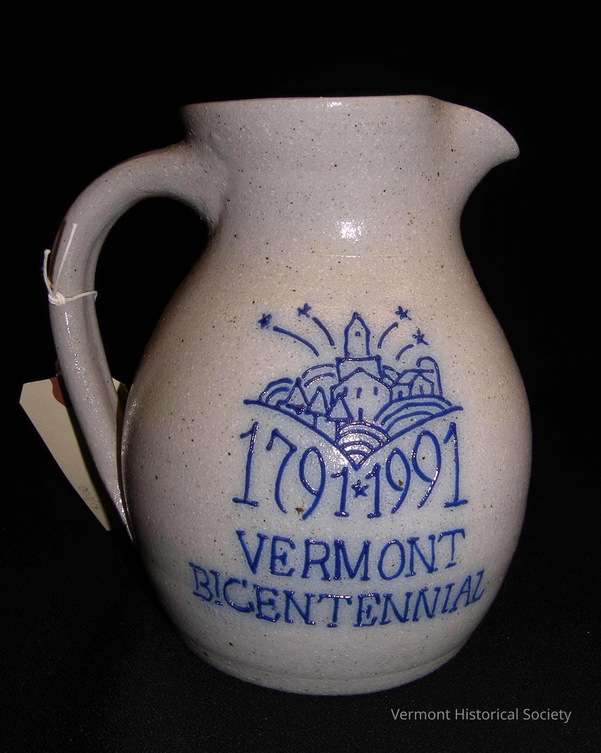 1-1/2 quart stoneware pitcher with blue slip decoration showing the logo for the Vermont Bicentennial. The pitcher has a long, applied handle, and the top opening has been pinched to form a pouring spout. The logo consists of a primitive depiction of fields, trees, a barn, a church, and fireworks above the inscription, "1791 1991 VERMONT BICENTENNIAL". The bottom of the pitcher is incised with the inscription, "1/2500 LTD." The interior is yellow glazed around the rim and brown glazed through the rest.Context
