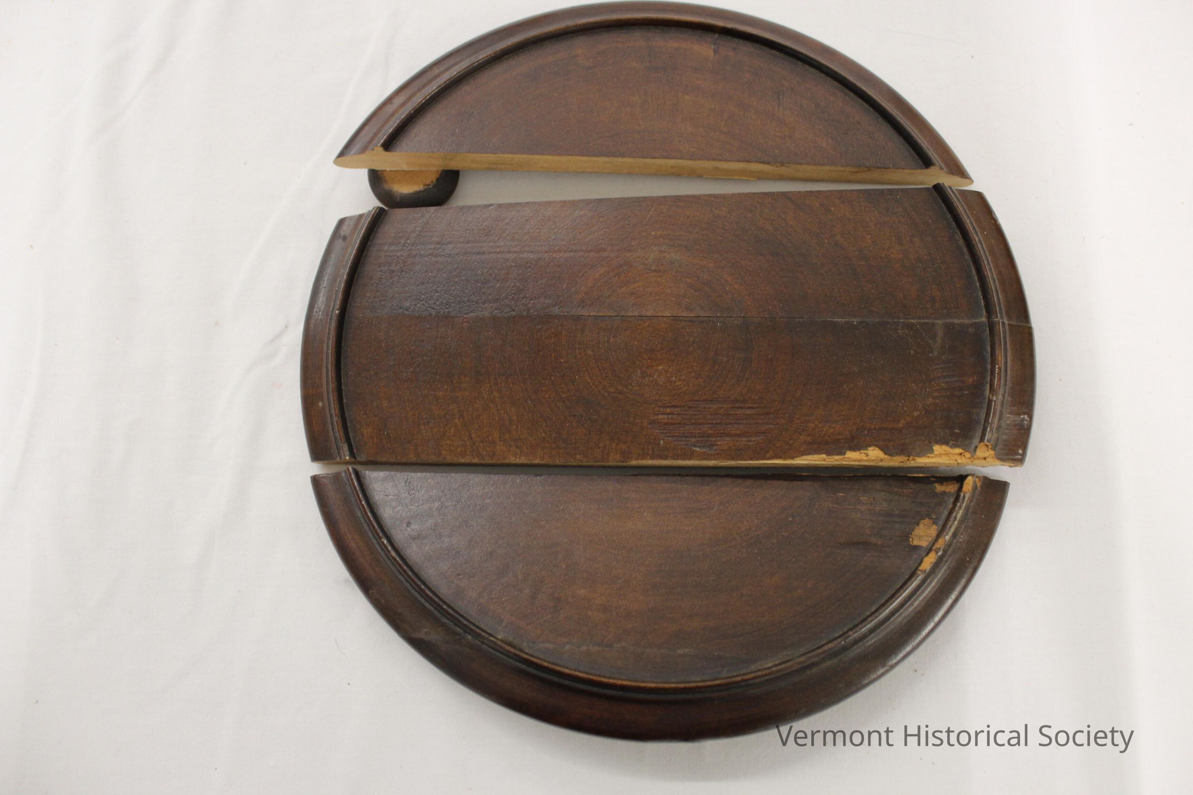 Round wooden tray that has split into three pieces. Made of dark, stained wood. There are four knob feet.Context