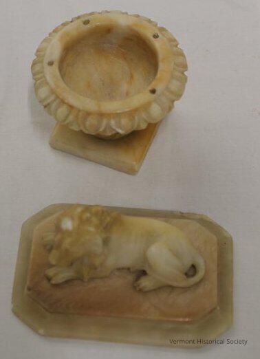 Two carved novelty items in a yellowish/orange stone. One is a resting lion on a platform with a white mark on its head. The other is a small decorative dish with a stem and four drilled holes on top. The purpose of the holes is unclear.Context
