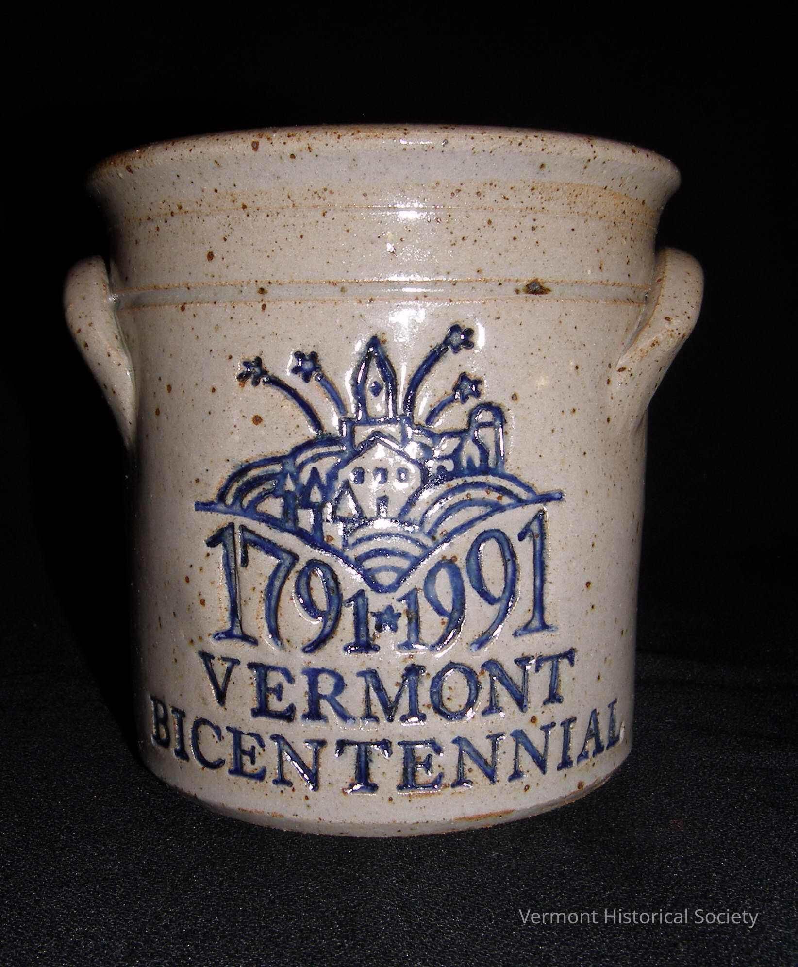 1-quart stoneware crock with blue incised decoration showing the logo for the Vermont Bicentennial. The straight-sided crock has U-shaped handles on either side. The logo consists of a primitive depiction of fields, trees, a barn, a church, and fireworks above the inscription, "1791 1991 VERMONT BICENTENNIAL". The bottom of the crock is incised with the inscription, "LTD. 1/1000". The interior is red glazed.Context