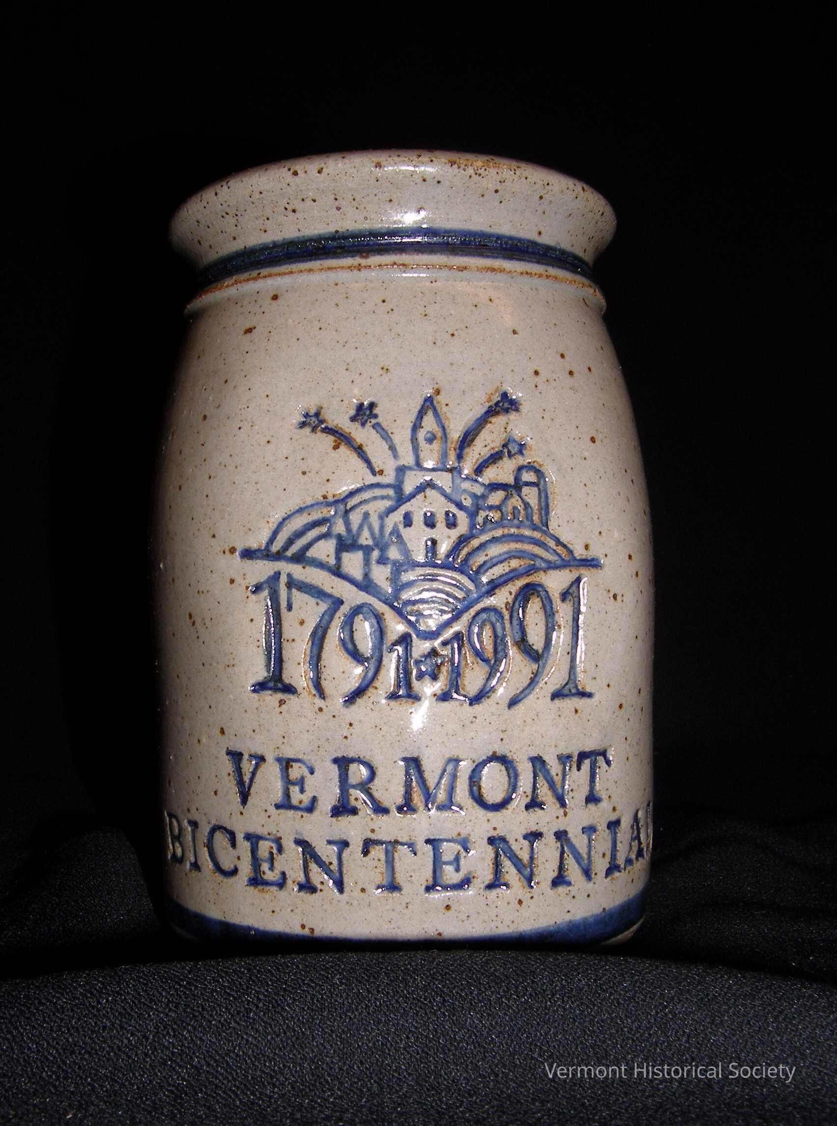 Stoneware spooner jar with blue incised decoration showing the logo for the Vermont Bicentennial. The logo consists of a primitive depiction of fields, trees, a barn, a church, and fireworks above the inscription, "1791 1991 VERMONT BICENTENNIAL". The bottom of the jar is incised with the inscription, "LTD. 1/12000".Context