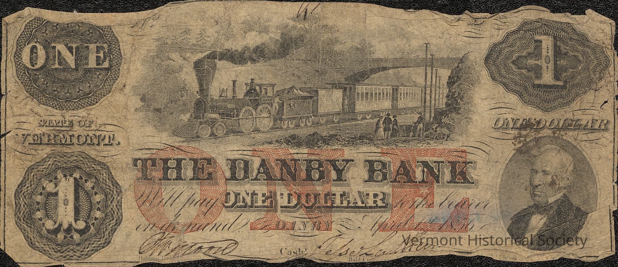 Private bank note for 1 dollar from The Danby Bank in Danby, Vermont. It is dated April 1st, 1856.