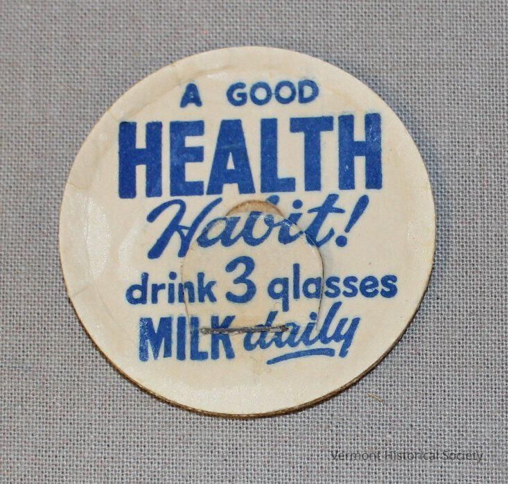 Milk bottle lid with blue lettering that states: " A GOOD HEALTH Habit! drink 3 glasses MILK daily". There is a metal staple at the base of the tab.Acquisition