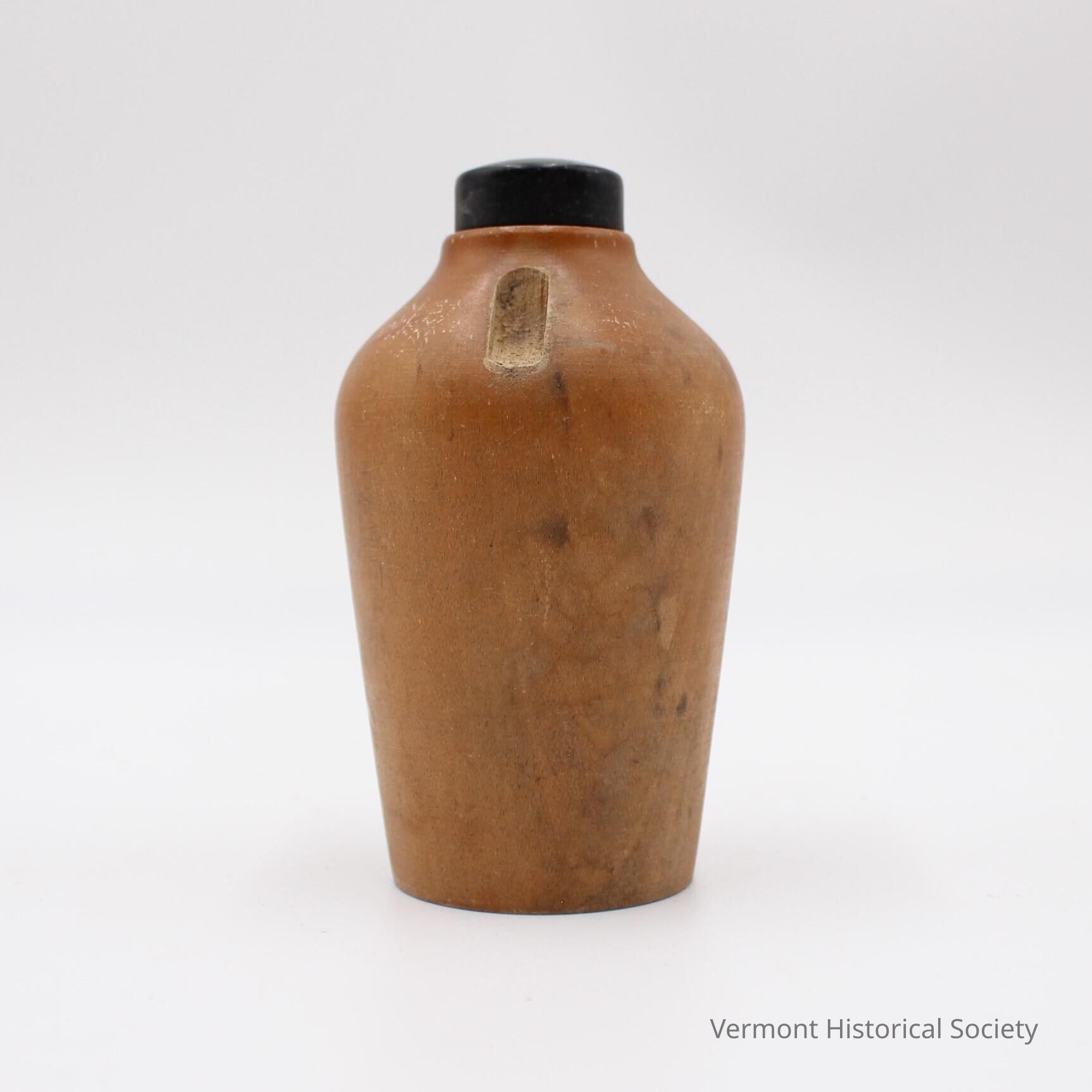 Wooden, jug-shaped bottle cover with a glass bottle inside. The bottle is held into the cover with a metal cap. The cover has a chip, which may be from a missing handle.Context