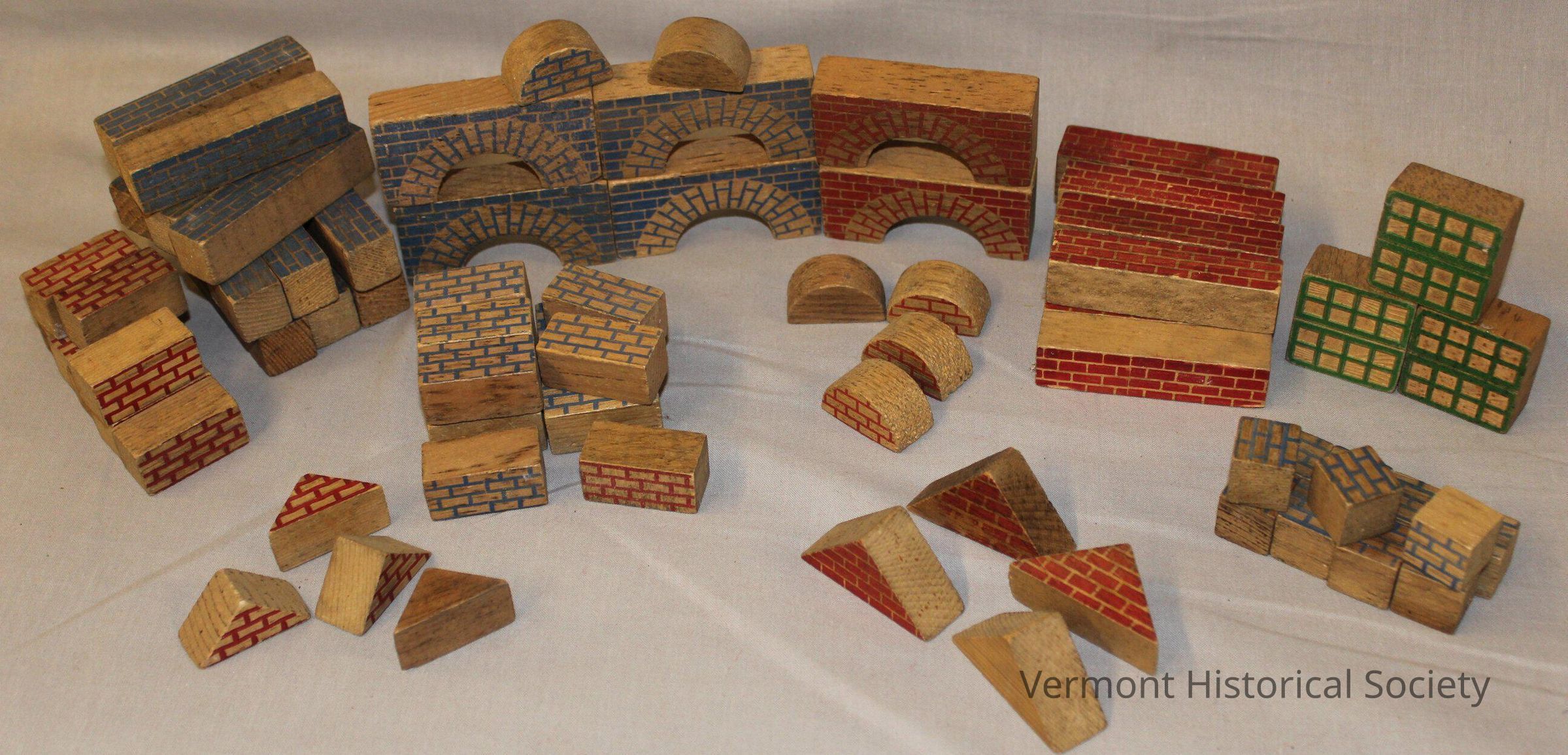 Set of building blocks printed with a brick pattern. The set includes 11 long rectangular blocks with blue printing; 9 long rectangular blocks with red printing; 12 short rectangular pieces with blue printing, 10 short rectangular pieces with red printing; 11 cubes with blue printing; 3 square pieces with green windowpane printing; 4 archways with blue printing; 2 archways with red printing; 2 domes with blue printing; 4 domes with red printing; 4 large triangle pieces with red printing; and 4 small triangle pieces with red printing.Context
