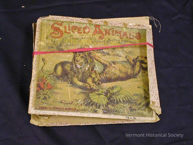 Puzzle game called "Sliced Animals" with its original box (now flattened). The box is printed with the title along with an image of two lions. The pieces combine to form several disparate puzzles rather than one large puzzle. Each piece is a rectangle containing a horizontal portion of an animal illustration along with a letter from the animal's name. When arranged correctly, the pieces form the illustration with the correctly spelled name along the left edge. The animals formed are cow, dog, giraffe, zebra, horse, tiger, camel, bear, rat, deer, sheep, buffalo, lion, goat, fox, and wolf. The back of the box is printed with a guide image showing all the completed animals, along with rules for making it into a game.Context