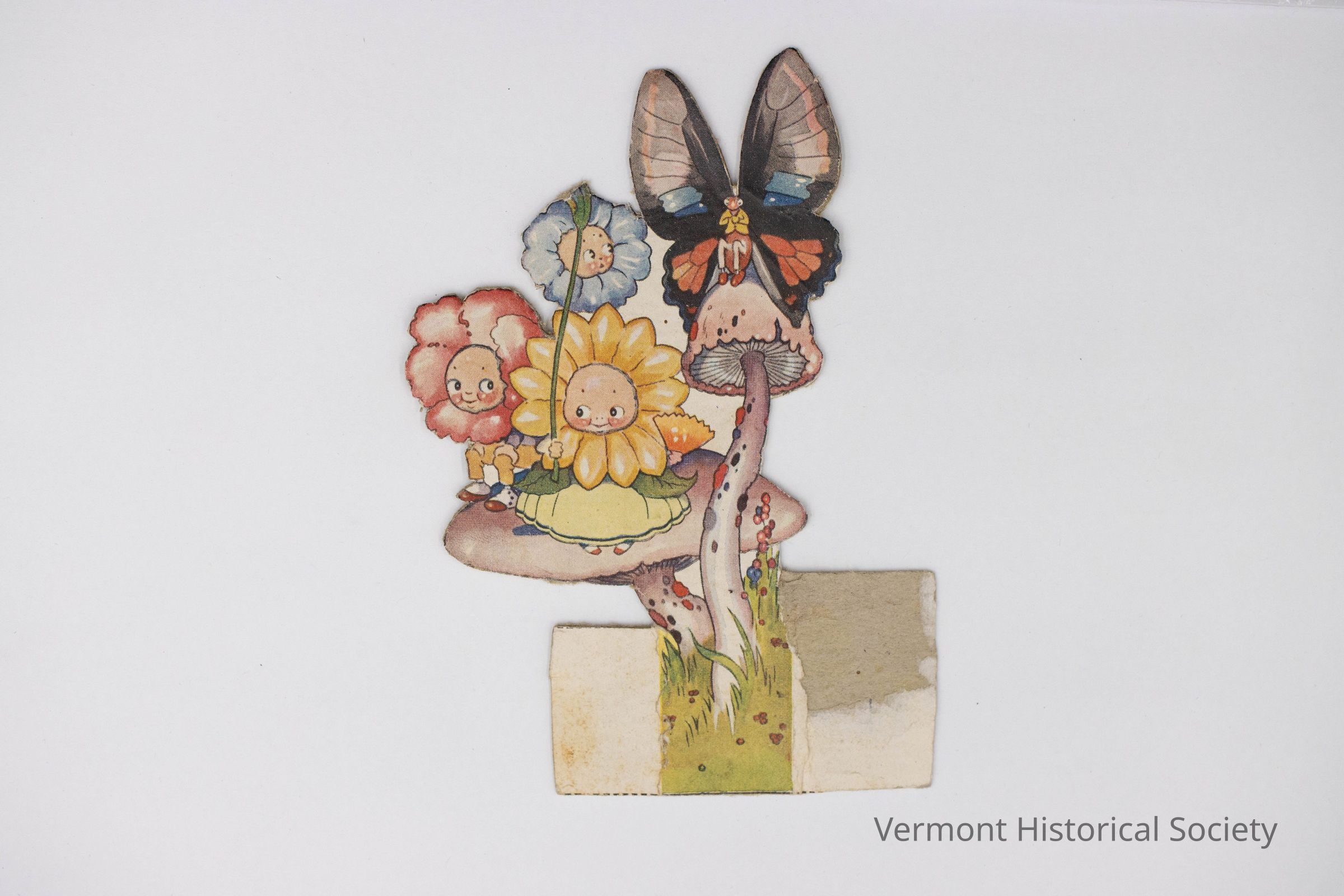 Small, cut-out cardboard standee showing three personified flowers and a butterfly sitting on mushrooms. The flowers have faces in the center of their petals, and all the characters are wearing clothes. There are two rectangular extensions on either side of the bottom that fold back to form a base. The back is labeled "SMS" in pencil, in a child's handwriting. Both Ss are backwards.Context