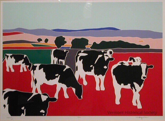 Brightly colored printed scene of several black-and-white spotted cows in a field. The field is color blocked in red, grey, and green. Hills and mountains in the background are red, orange, green, pink, and purple. The print is matted under a cream-colored mat and framed in a narrow, light wood frame.Acquisition