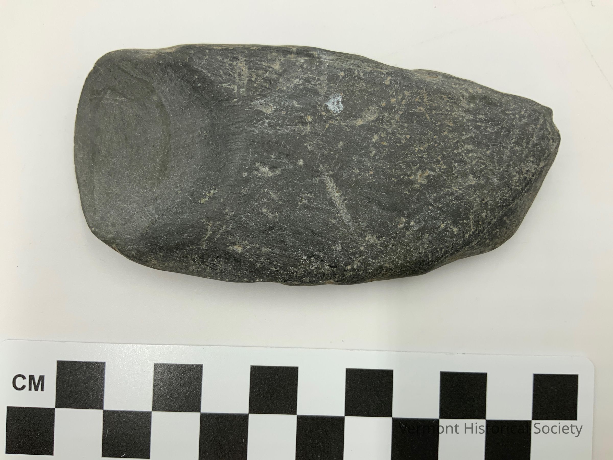 Chipped stone tool made from a naturally rectangular stone. Three edges are chipped to thin them.Context