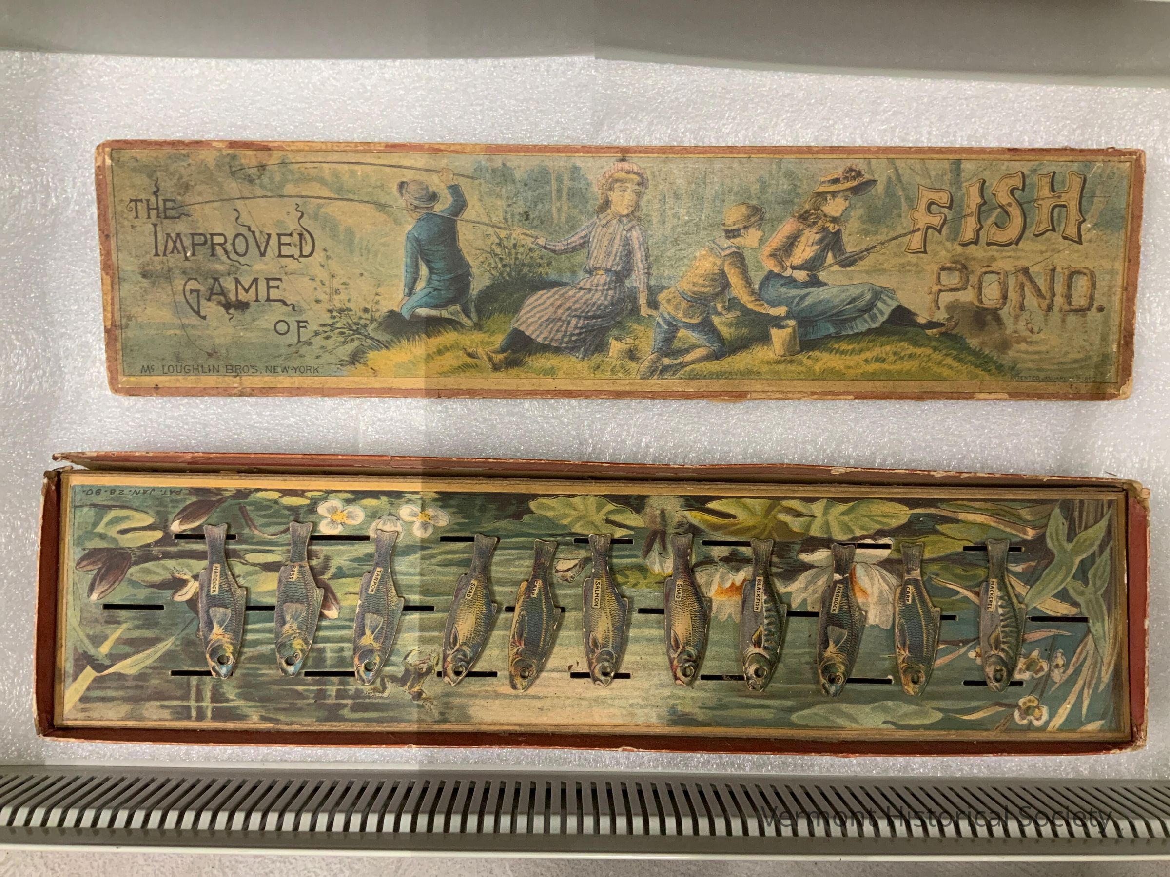 Long, rectangular board came contained within a box. The lid is printed with a scene of children (two girls and two boys) in Victorian clothing fishing from a grassy hill. The title, 'THE IMPROVED GAME OF / FISH POND." is printed on either side of the group. Inside, the game board fits snugly into the box and is printed with an artistic rendering of the surface of a lake or pond with water lilies. There are 22 slits spaced evenly across the board in 3 rows. There are also several die-cut fish (11 remaining). While the fish are very similar in appearance, they are printed on one side with a small species name (bass, haddock, tarpon, shad, carp, salmon, blackfish, mackerel) and on the other side with a number within a circle. There are round holes where the eyes would be. The inside of the lid is printed with gameplay instructions.Context