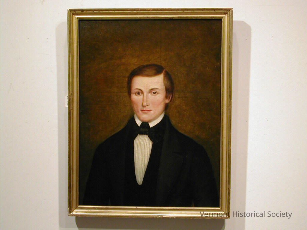 Folk-style portrait showing a young man with short brown hair parted at the side. He is wearing a black jacket, vest, and bowtie with a white, pleated shirt. He is in front of a brown background.Artwork Details