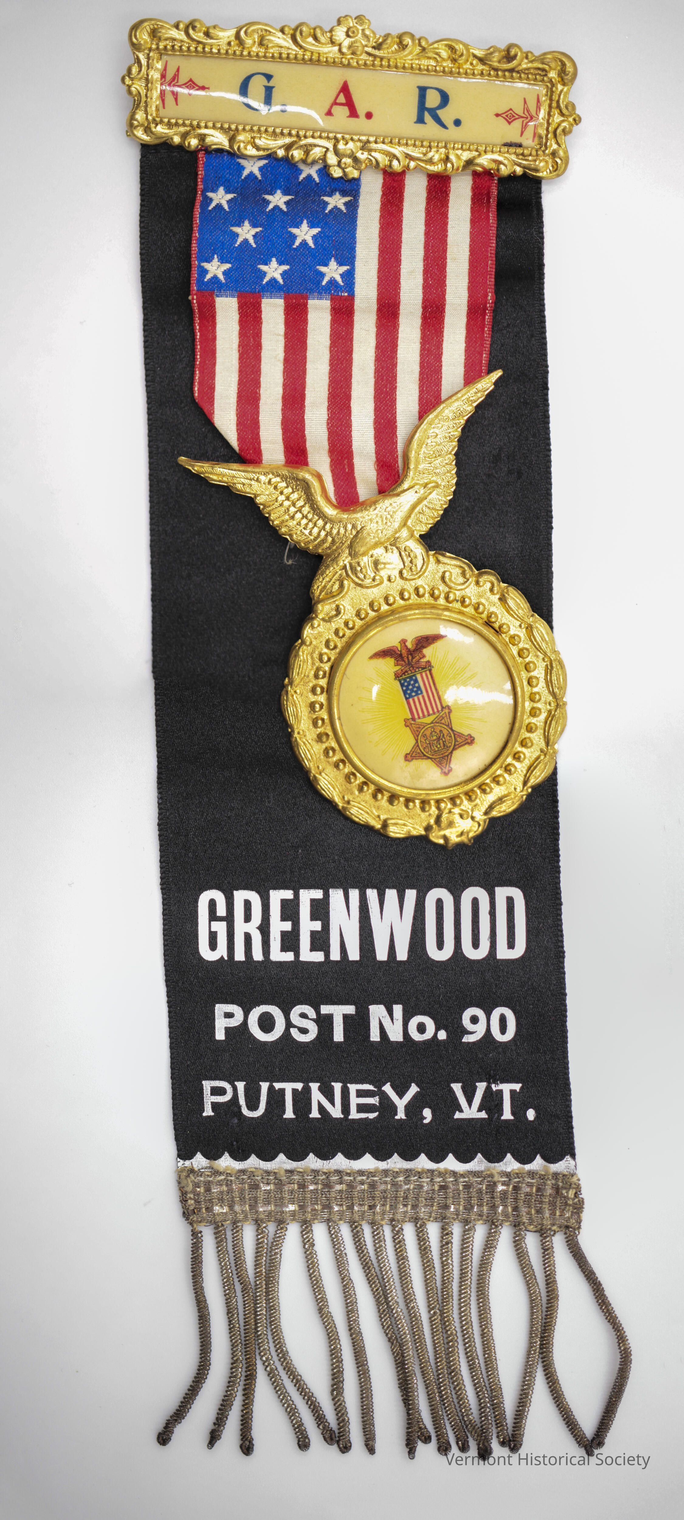 Mourning badge consisting of a stamped metal bar pin, a medallion hanging from a ribbon, and long black ribbon. The bar pin is printed with the initials, "G.A.R." From the bar hangs a ribbon woven to look like the American flag. from the ribbon hangs a medallion topped with a flying eagle and printed with an image of a GAR membership ribbon. The black ribbon is printed in silver with the inscription, "GREENWOOD POST No. 90 PUTNEY, VT."Context