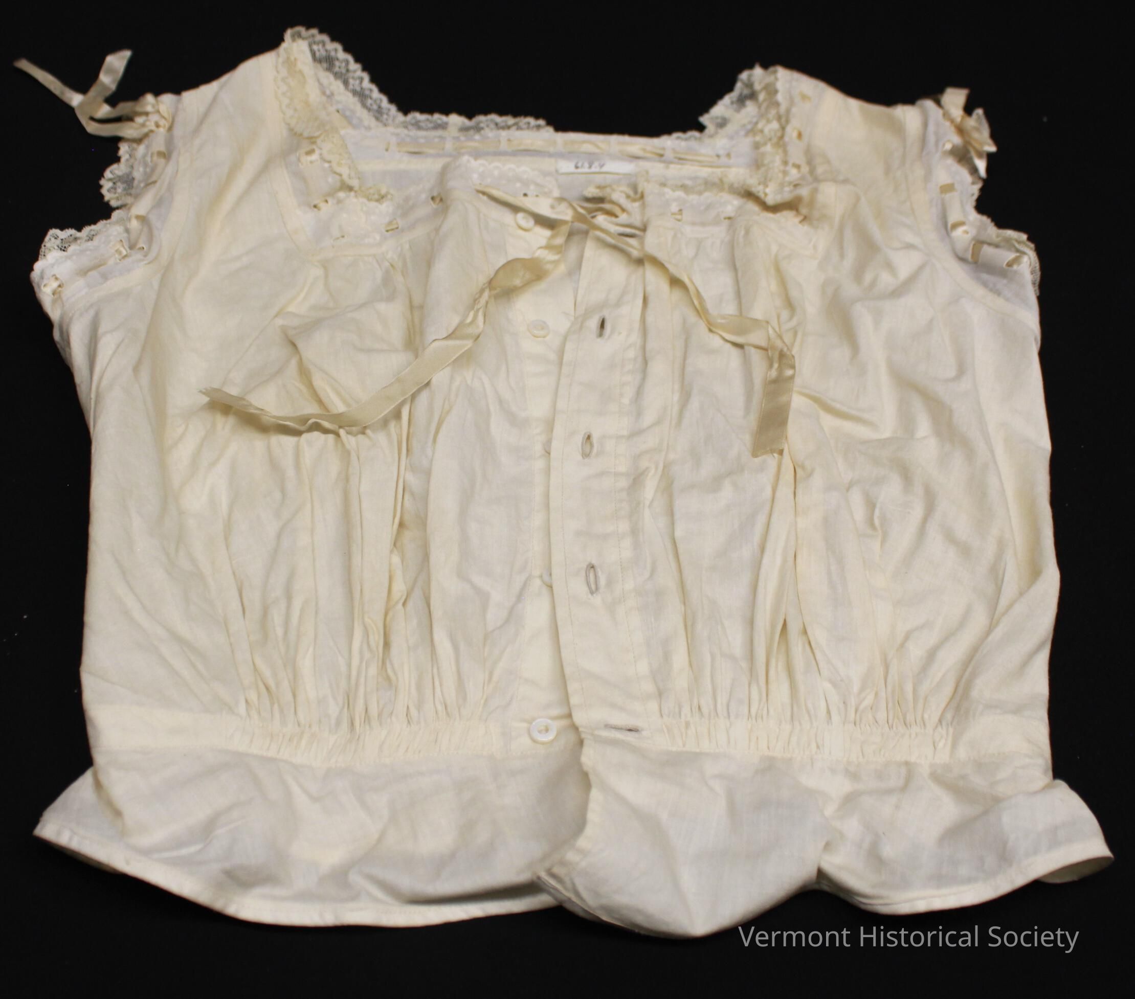 White cotton corset cover. The cover secures down the center front with five white buttons, and the neckline secures with a draw string tied at the center front. The two front panels are gathered into the waistband, as does the back, and there is a short peplum. The neckline and armscyes are trimmed with lace and beige ribbon.