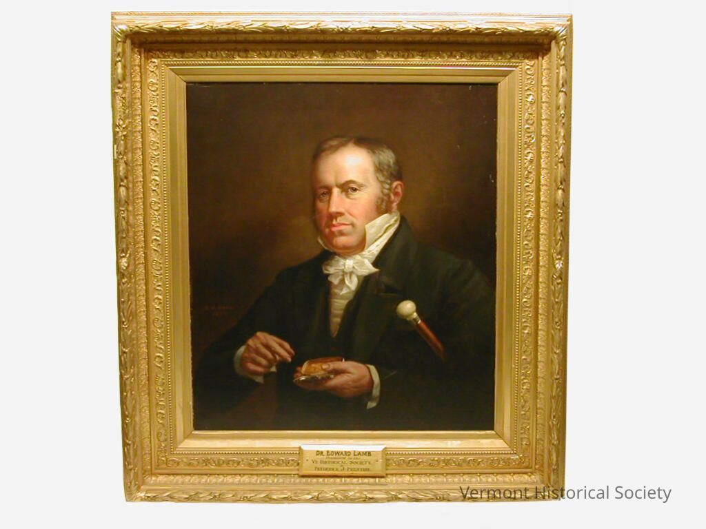 Born in Charlton, MA in 1771, Dr. Edward Lamb served Montpelier from his arrival in 1796 until his death in 1845. Frederick Prentiss commissioned this portrait for the Vermont Historical Society well after Lamb's death.